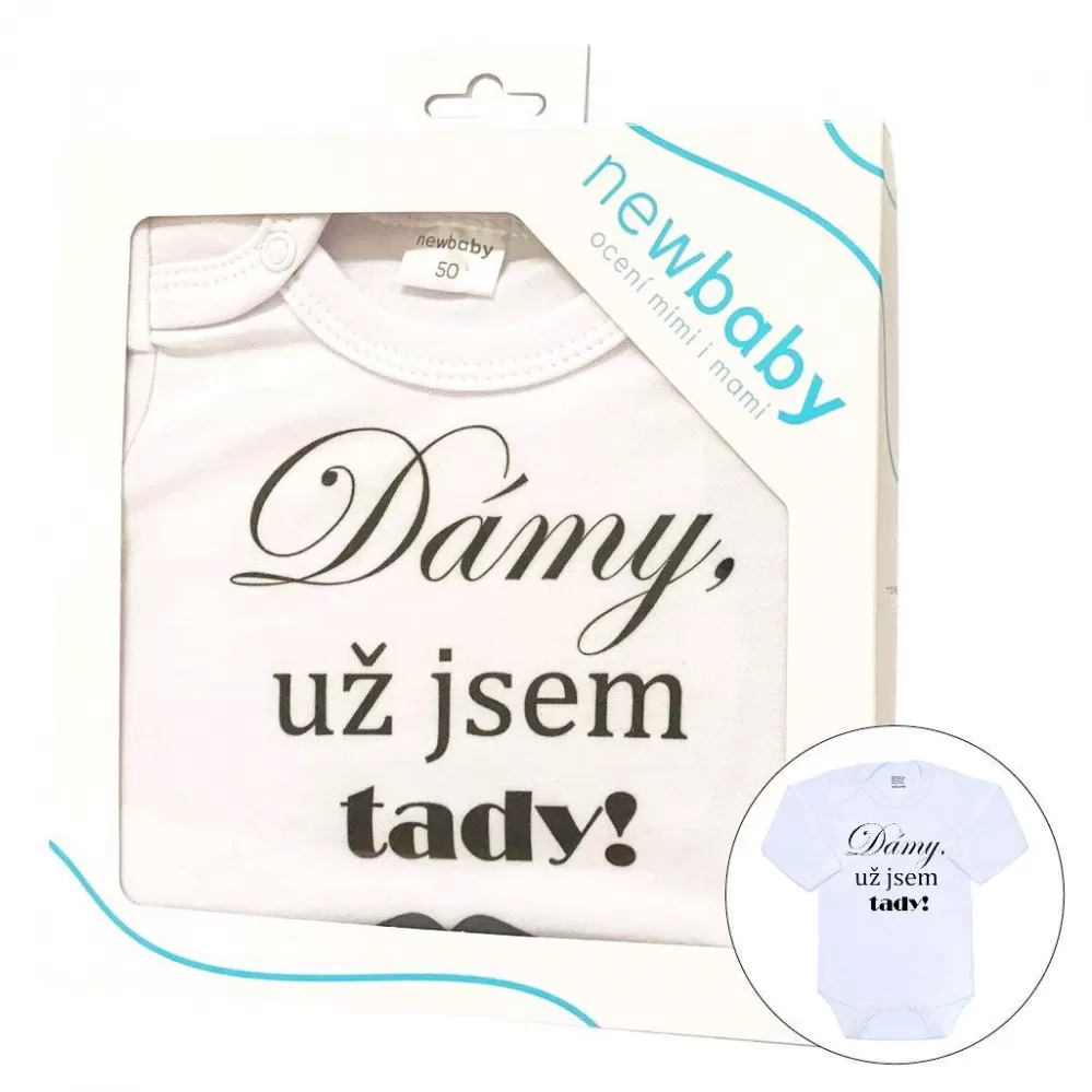 Originální bavlněné kojenecké body s dlouhým rukávem New Baby, s vtipným nápisem Dámy, už jsem tady! Barvy použité k potisku jsou certifikované a vhodné pro miminka. Je vyrobeno z příjemného a kvalitního materiálu, ve kterém se bude Vaše miminko cítit příjemně. Body má zapínáni na cvočky na ramínku a mezi nožičkami, což usnadňuje oblékání a přebalování. Dopřejte Vašemu miminku vyniknout v originálním body. Složení: 100% bavlna. Rozměry: obvod kolem hrudníku cca 36 cm, délka rukávu cca 18 cm, celková délka cca 32 cm.