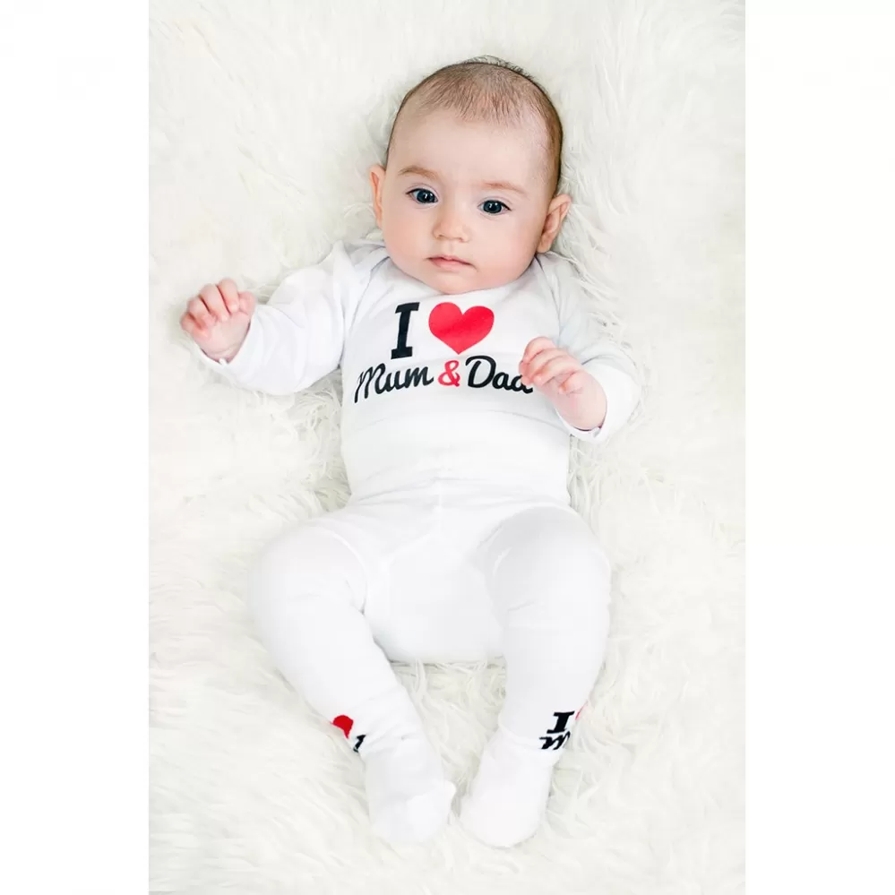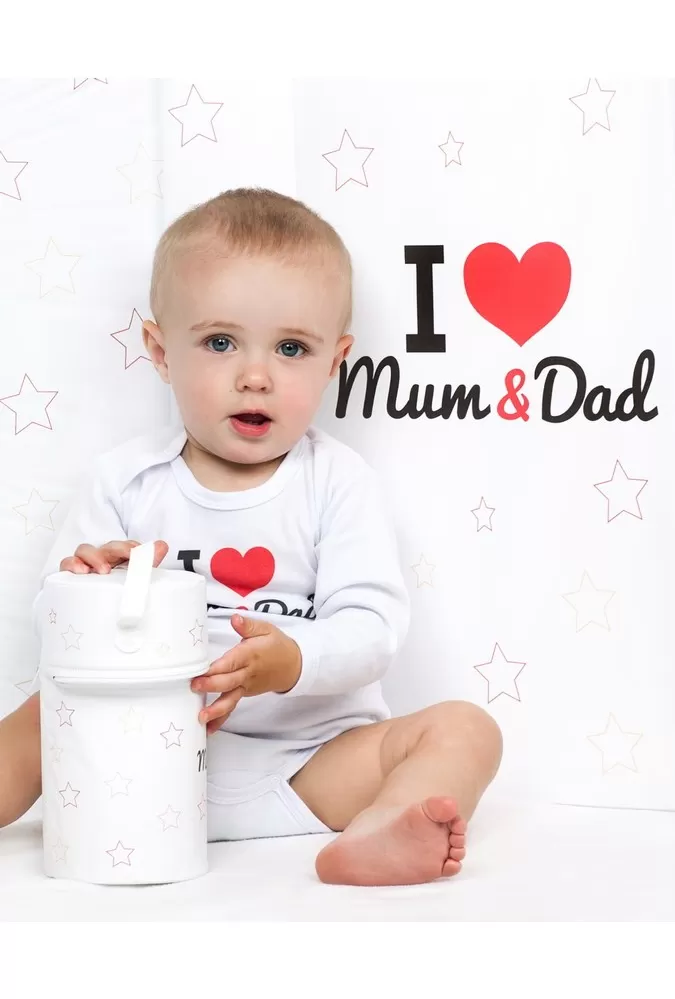 Originální bavlněné kojenecké body s dlouhým rukávem New Baby, s vtipným nápisem I Love Mum and Dad. Barvy použité k potisku jsou certifikované a vhodné pro miminka. Je vyrobeno z příjemného a kvalitního materiálu, ve kterém se bude Vaše miminko cítit příjemně. Body má zapínáni na cvočky na ramínku a mezi nožičkami, což usnadňuje oblékání a přebalování. Dopřejte Vašemu miminku vyniknout v originálním body. Složení: 100% bavlna. Rozměry: obvod kolem hrudníku cca 50 cm, délka rukávu cca 26 cm, celková délka cca 42 cm.