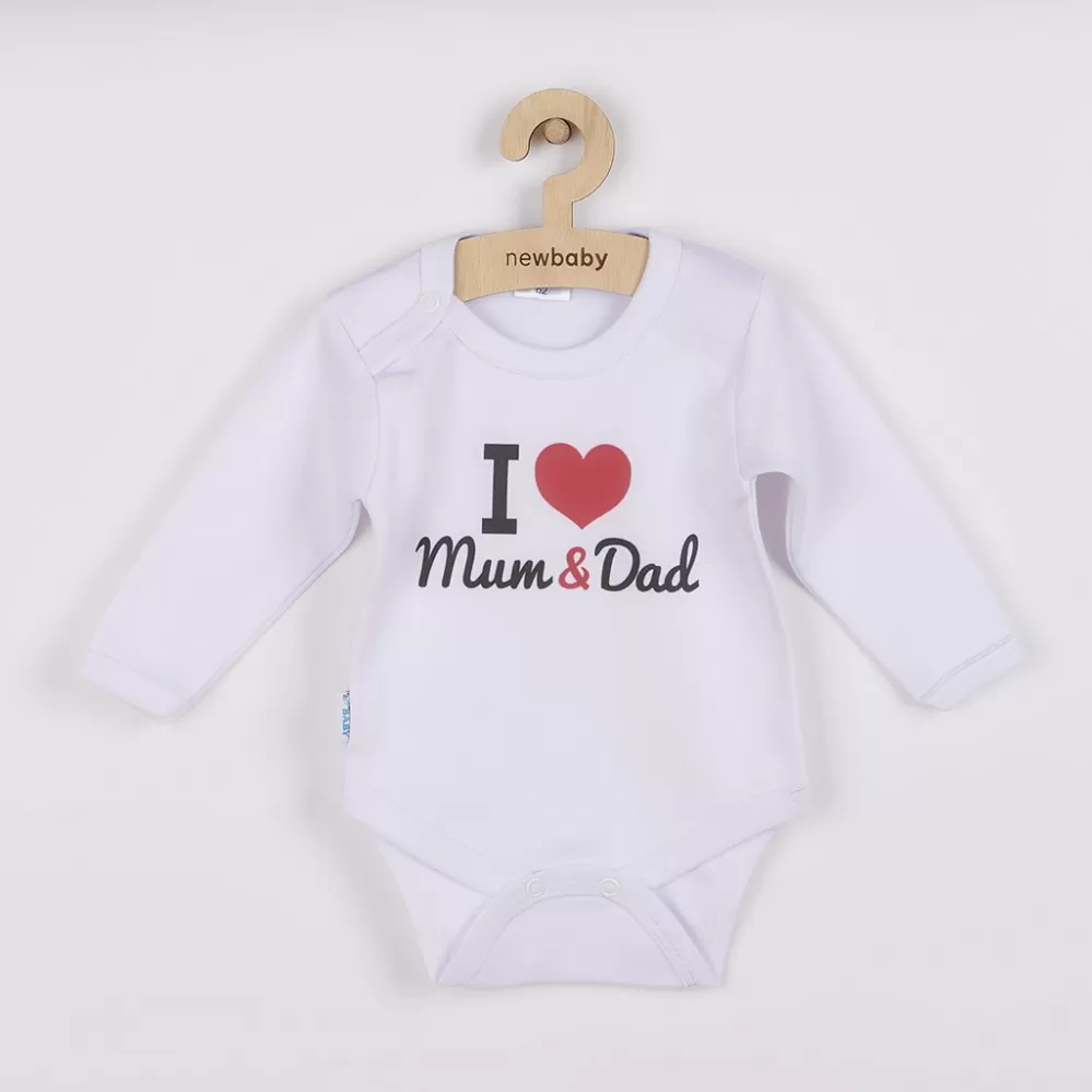 Originální bavlněné kojenecké body s dlouhým rukávem New Baby, s vtipným nápisem I love Mum and Dad. Barvy použité k potisku jsou certifikované a vhodné pro miminka. Je vyrobeno z příjemného a kvalitního materiálu, ve kterém se bude Vaše miminko cítit příjemně. Body má zapínáni na cvočky na ramínku a mezi nožičkami, což usnadňuje oblékání a přebalování. Dopřejte Vašemu miminku vyniknout v originálním body. Složení: 100% bavlna. Rozměry: obvod kolem hrudníku cca 34 cm, délka rukávu cca 16 cm, celková délka cca 30 cm.