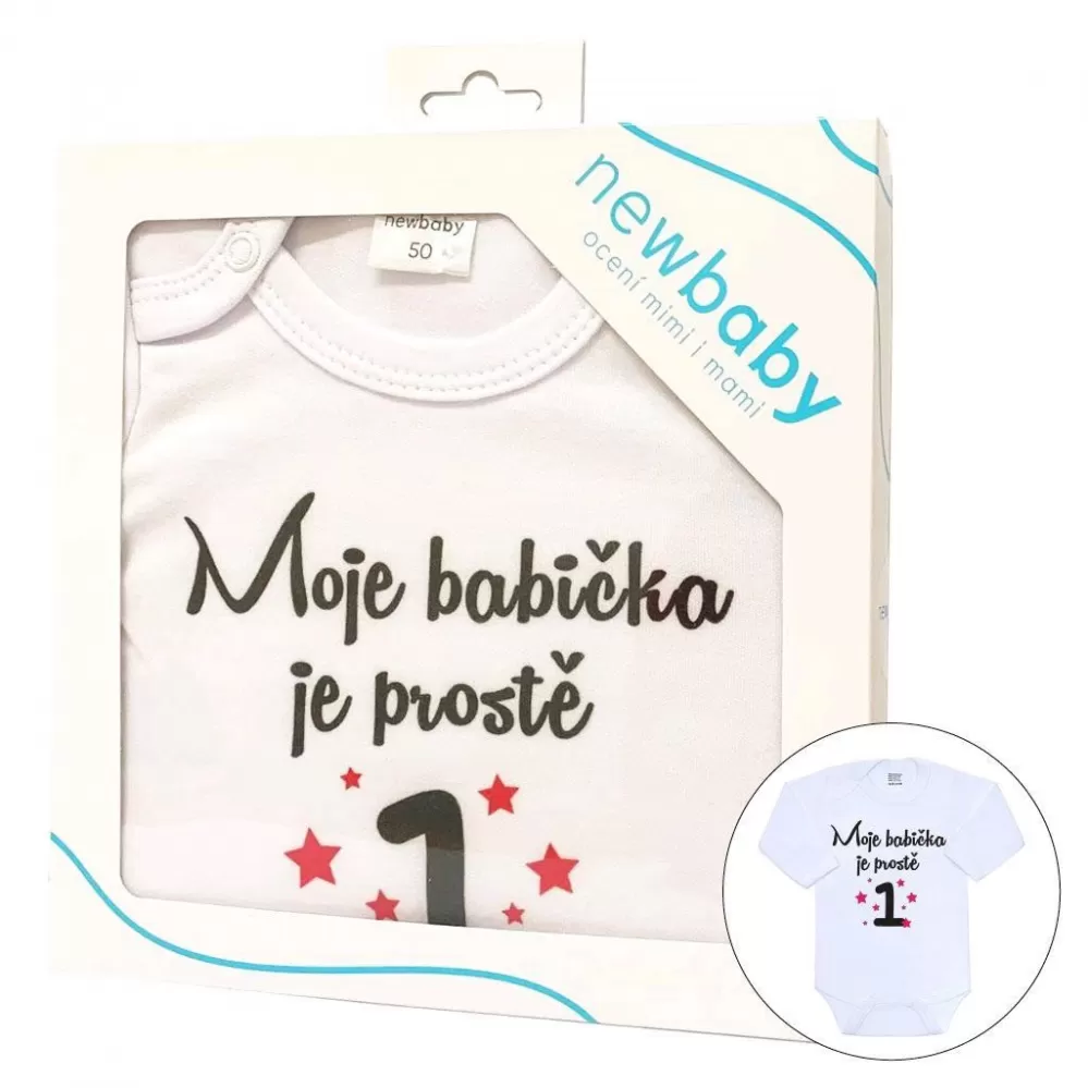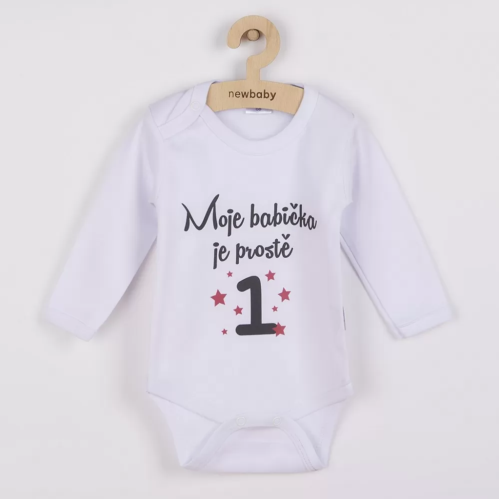 Originální bavlněné kojenecké body s dlouhým rukávem New Baby, s vtipným nápisem Moje babička je prostě jednička. Barvy použité k potisku jsou certifikované a vhodné pro miminka. Je vyrobeno z příjemného a kvalitního materiálu, ve kterém se bude Vaše miminko cítit příjemně. Body má zapínáni na cvočky na ramínku a mezi nožičkami, což usnadňuje oblékání a přebalování. Dopřejte Vašemu miminku vyniknout v originálním body. Složení: 100% bavlna. Rozměry: obvod kolem hrudníku cca 46 cm, délka rukávu cca 24 cm, celková délka cca 40 cm.