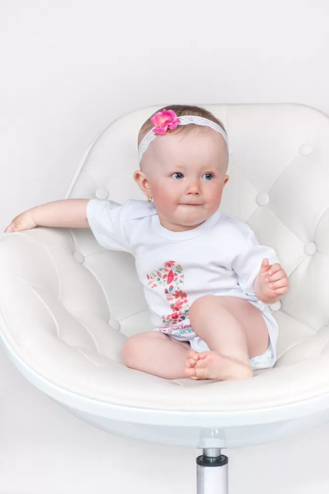 Originální bavlněné kojenecké body s dlouhým rukávem New Baby, s vtipným nápisem Už mám 1 rok a obrázkem velké jedničky s balónky. Barvy použité k… Celý popis