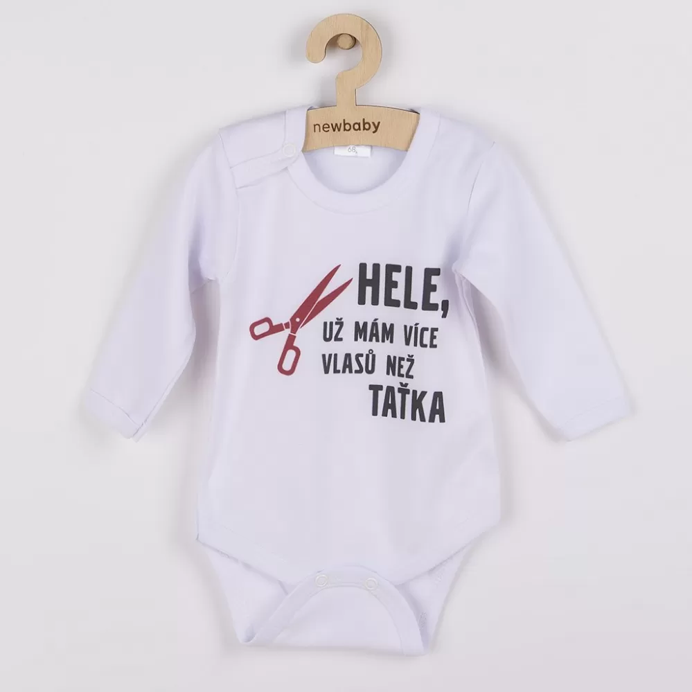 Originální bavlněné kojenecké body s dlouhým rukávem New Baby, s vtipným nápisem HELE, UŽ MÁM VÍCE VLASŮ NEŽ TAŤKA. Barvy použité k potisku jsou certifikované a vhodné pro miminka. Je vyrobeno z příjemného a kvalitního materiálu, ve kterém se bude Vaše miminko cítit příjemně. Body má zapínáni na cvočky na ramínku a mezi nožičkami, což usnadňuje oblékání a přebalování. Dopřejte Vašemu miminku vyniknout v originálním body. Složení: 100% bavlna. Rozměry: obvod kolem hrudníku cca 34 cm, délka rukávu cca 16 cm, celková délka cca 30 cm.