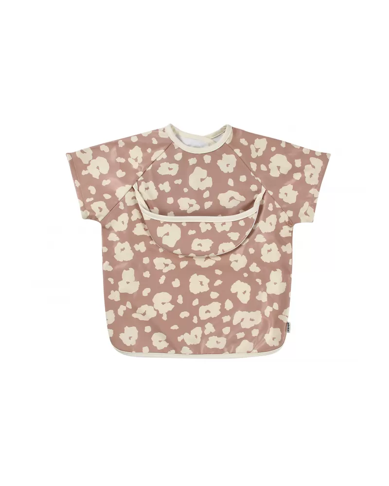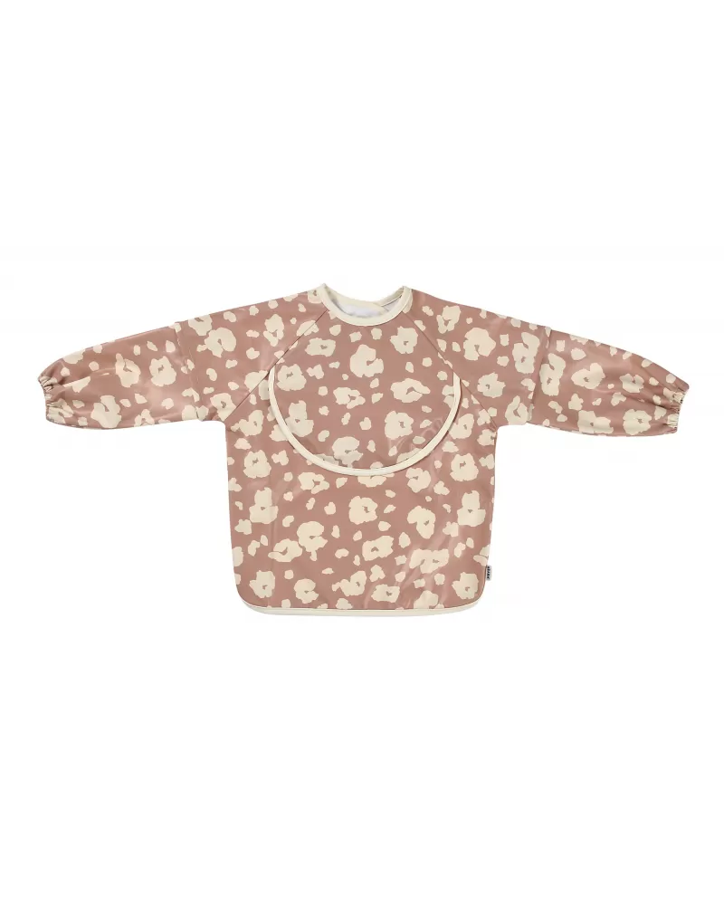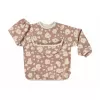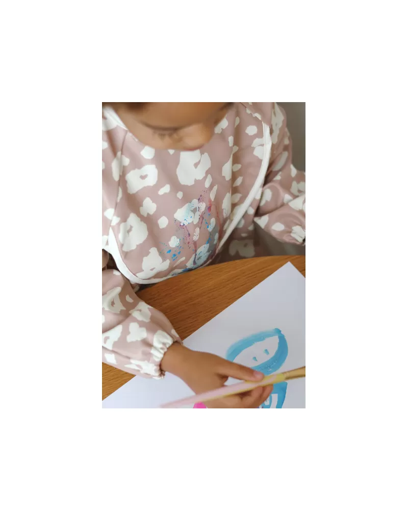 Nastavitelné zapínání na druky za krkem umožňuje snadné oblékání i přizpůsobení bryndáku velikosti dítěte. Elastické zakončení rukávů poskytuje pohodlí při nošení.