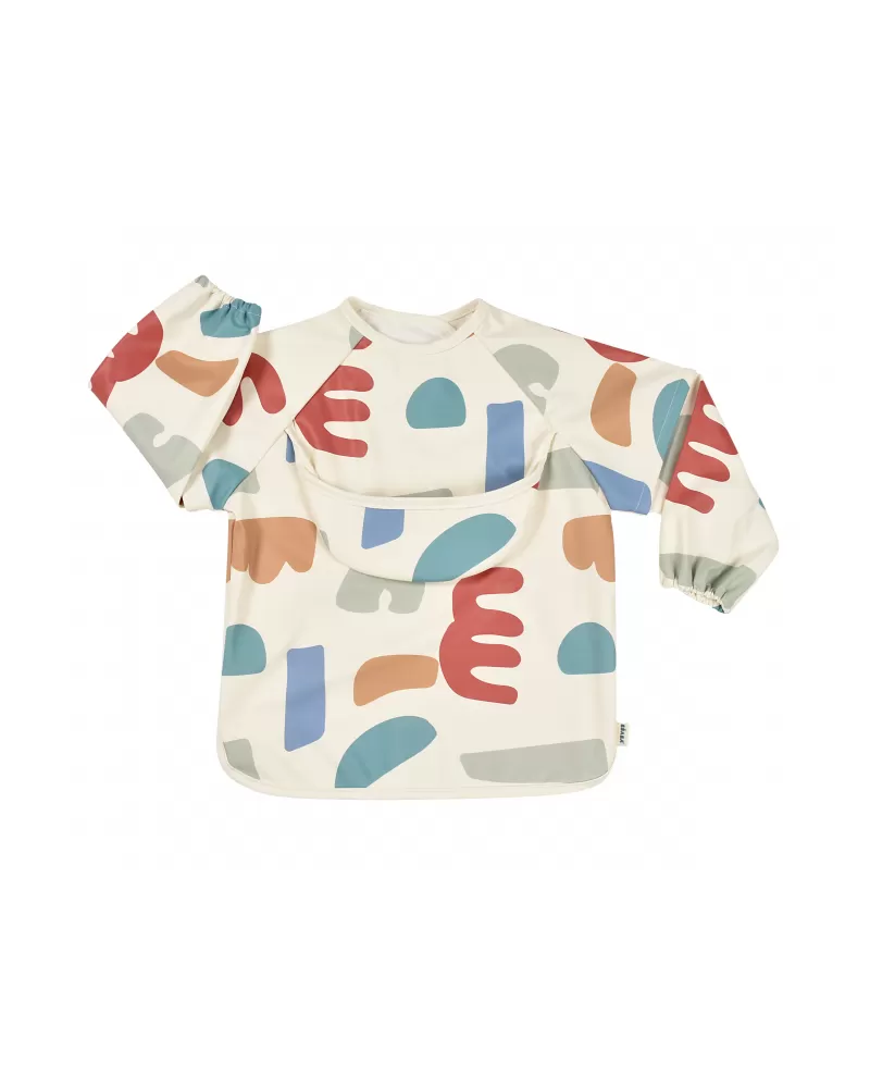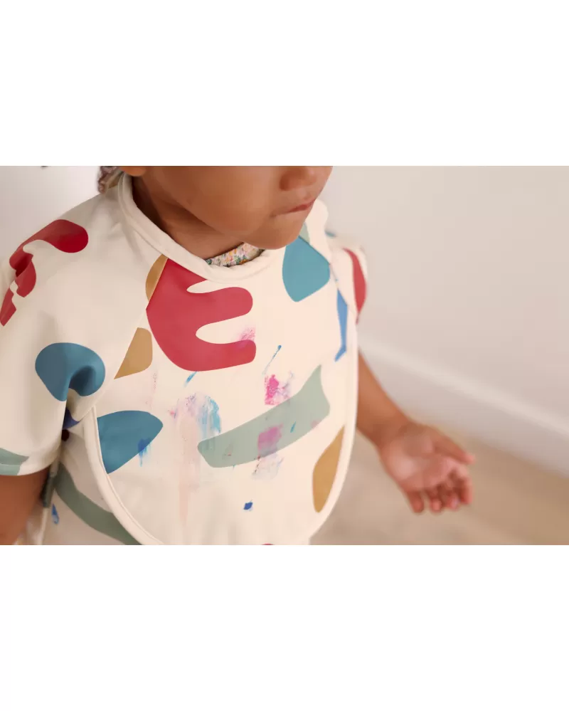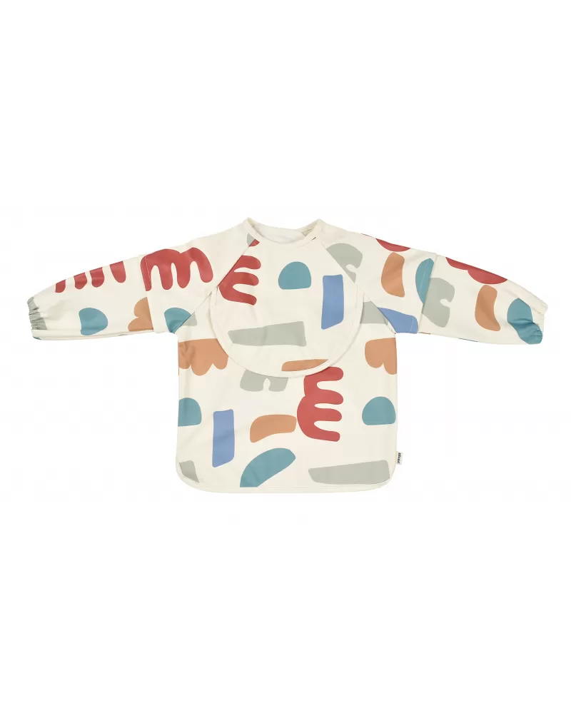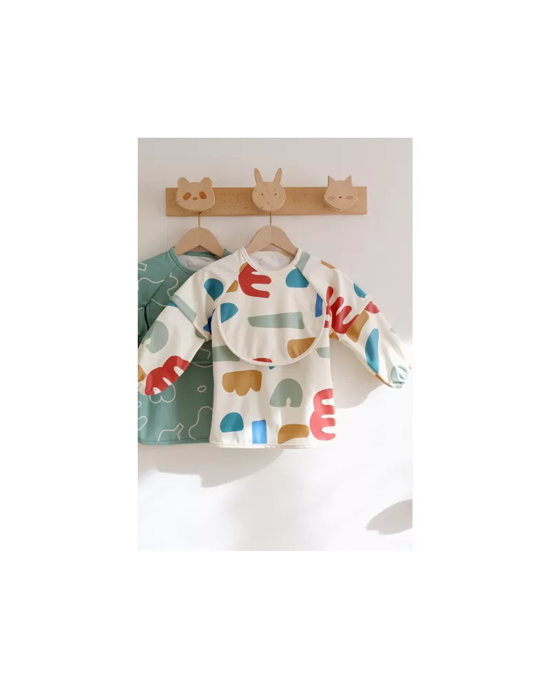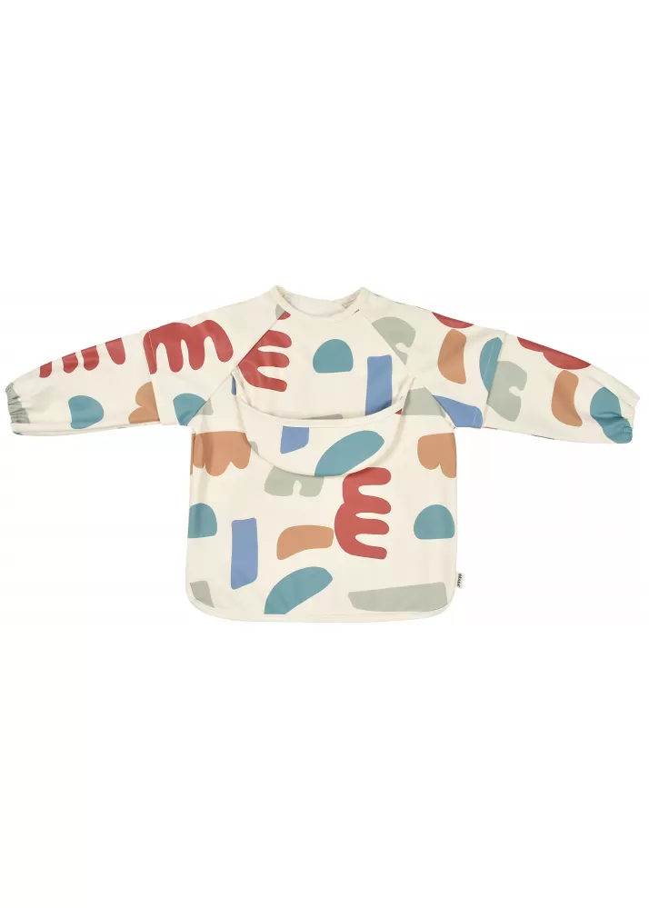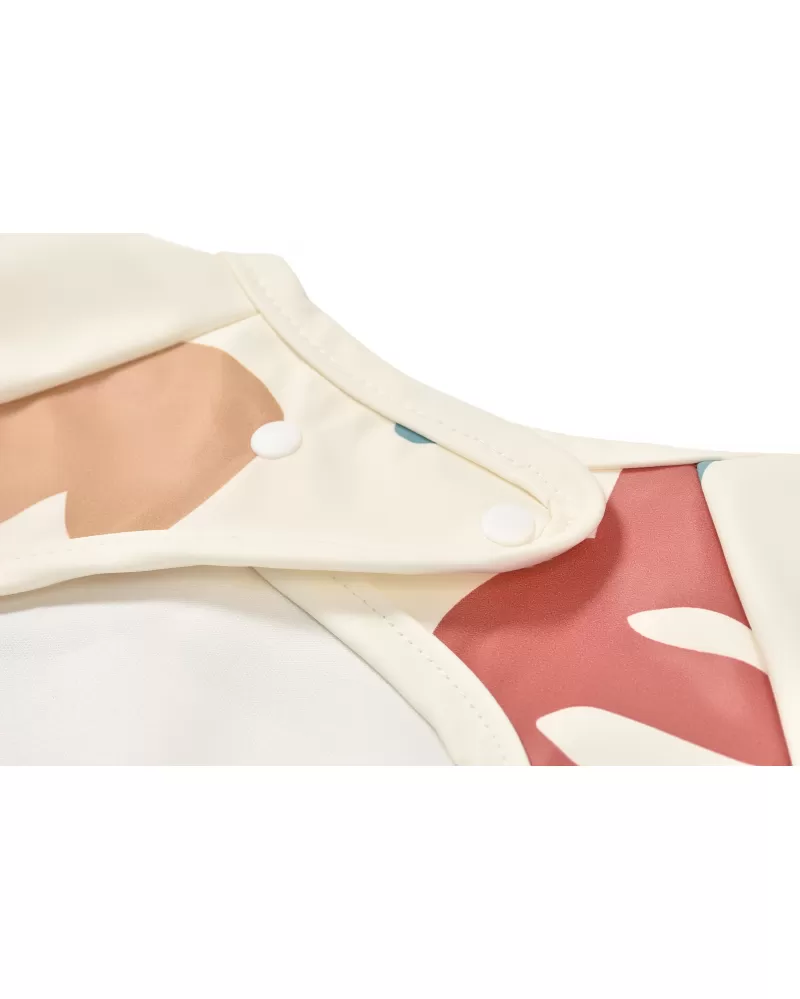 Nastavitelné zapínání na druky za krkem umožňuje snadné oblékání i přizpůsobení bryndáku velikosti dítěte. Elastické zakončení rukávů poskytuje pohodlí při nošení.