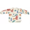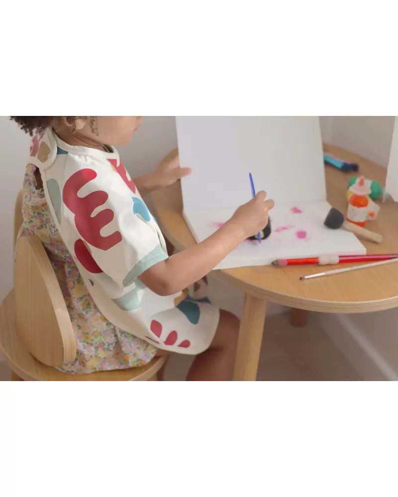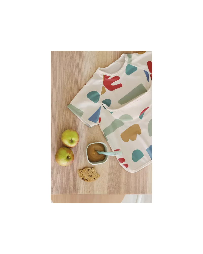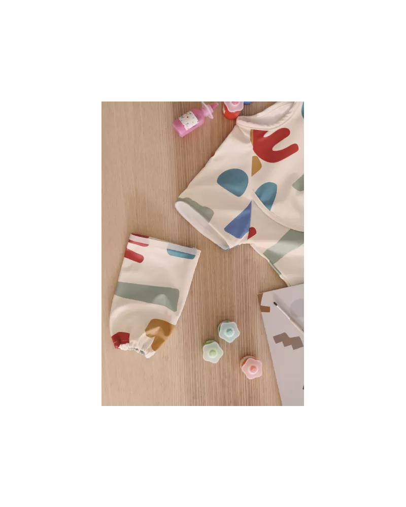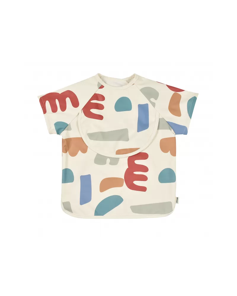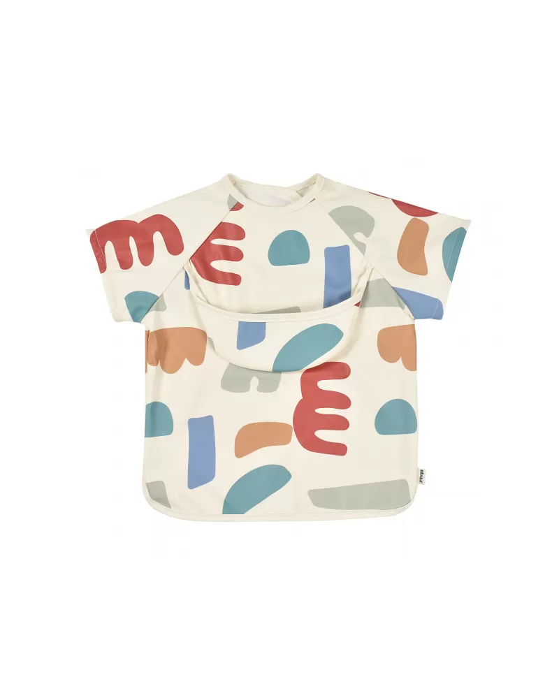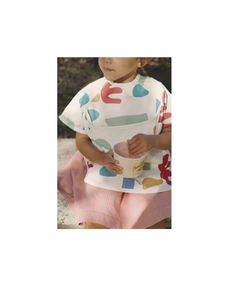 Nastavitelné zapínání na druky za krkem umožňuje snadné oblékání i přizpůsobení bryndáku velikosti dítěte. Elastické zakončení rukávů poskytuje pohodlí při nošení.