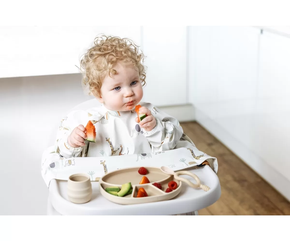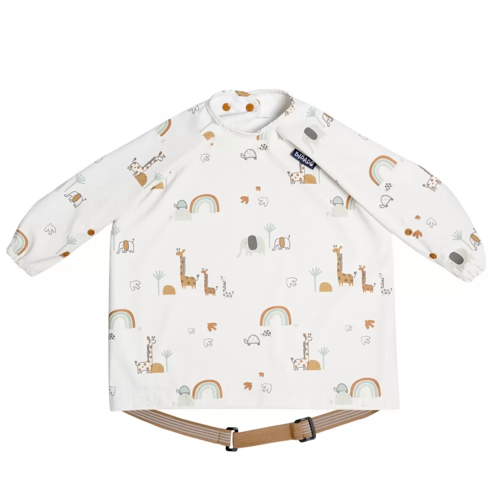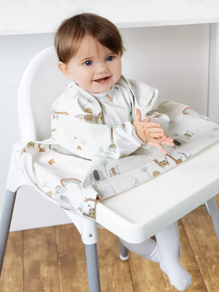 • integrovaný pásek pomůže navléknout spodní část bryndáku na pultík u jídelní židličky, dítěti tak nepadají zbytky jídla do klína a na oblečení
