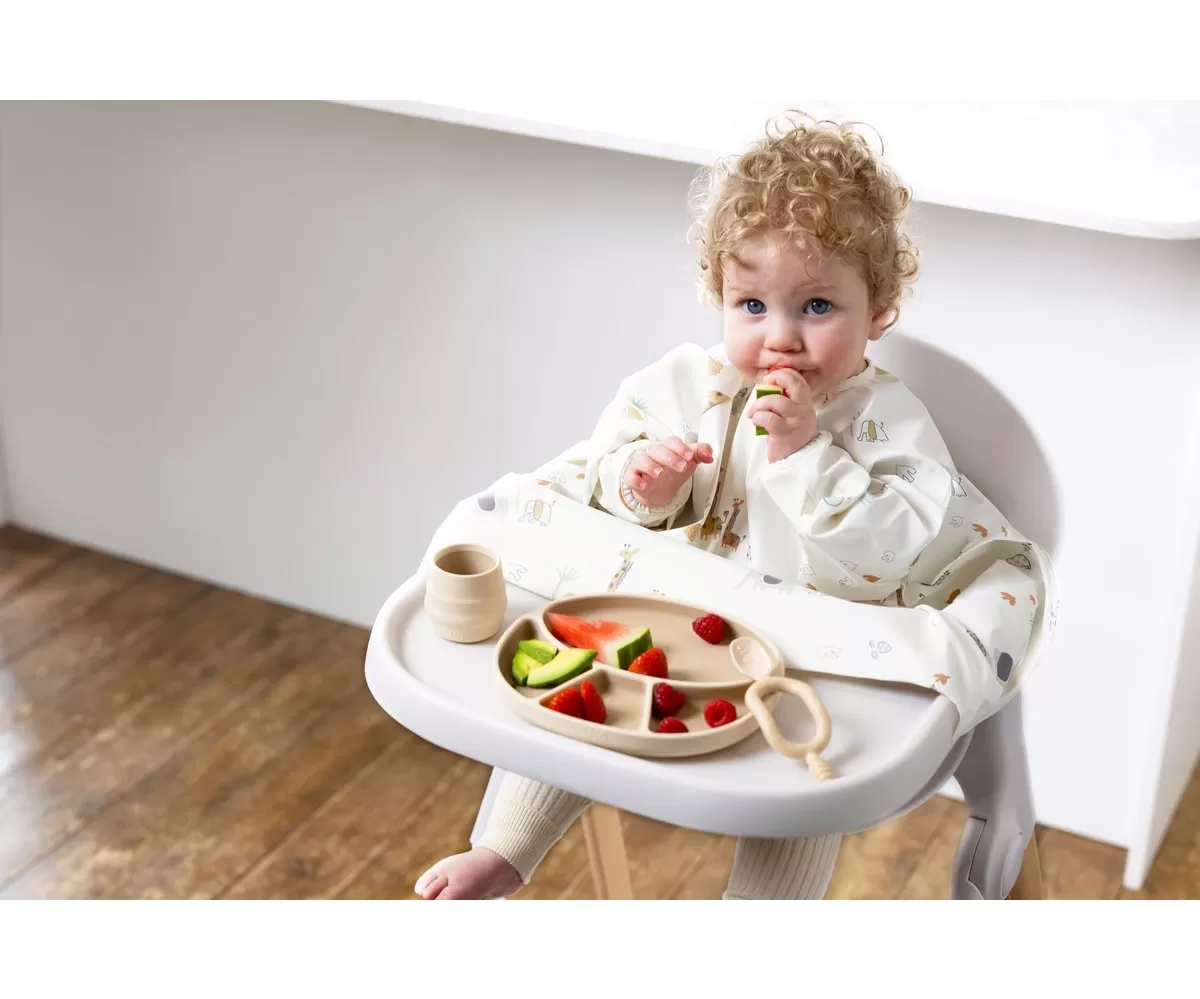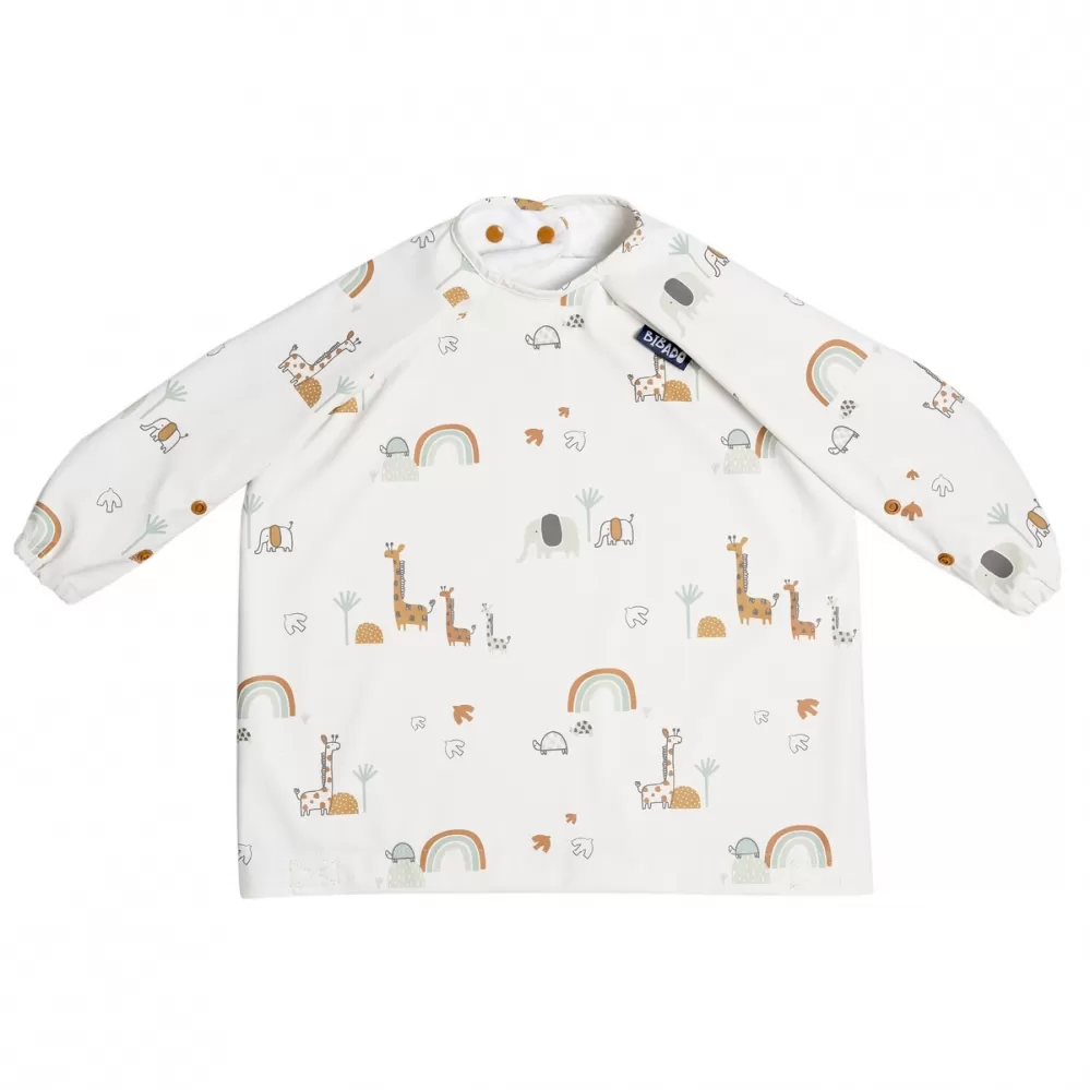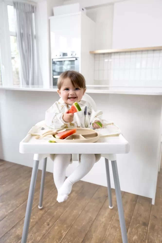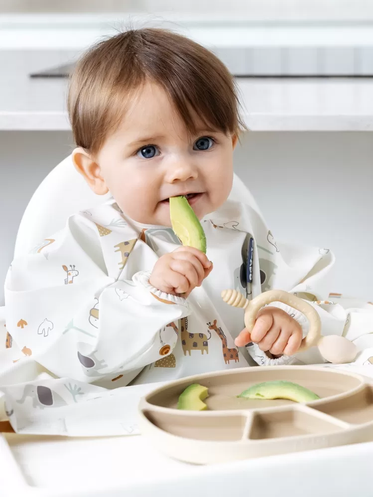 • integrovaný pásek pomůže navléknout spodní část bryndáku na pultík u jídelní židličky, dítěti tak nepadají zbytky jídla do klína a na oblečení