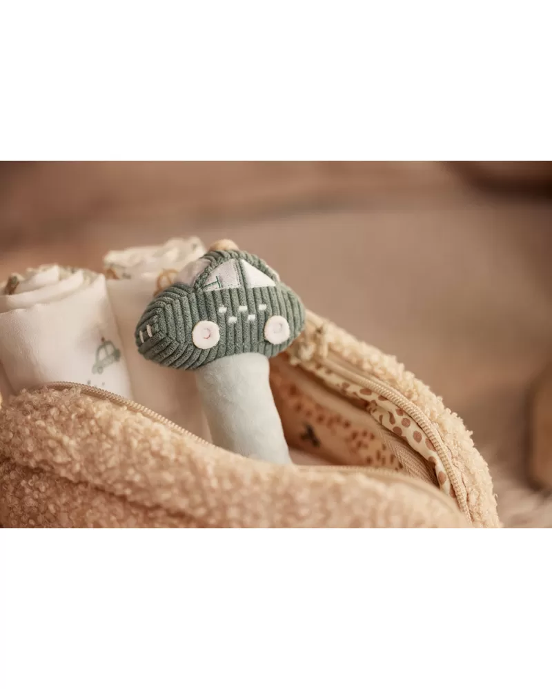 Chrastítko v podobě autíčka z měkkého textilního materiálu má tvar pro snadné uchopení a při pohybu jemně chrastí.