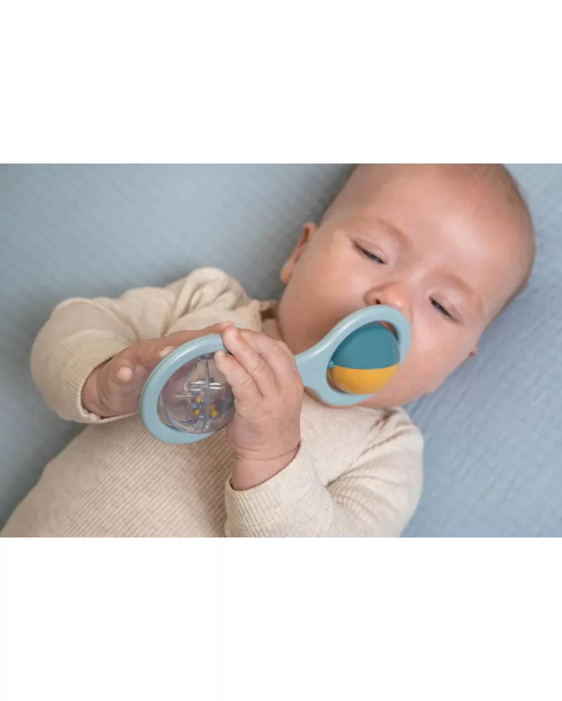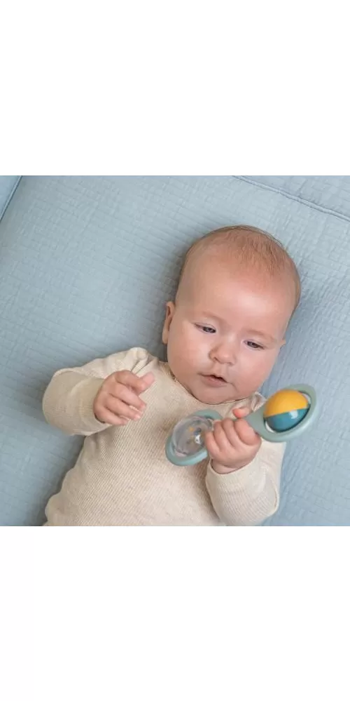 Chrastítko se dvěma otáčejícími se kuličkami je ideální jako první hračka pro vaše miminko. Pozornost dítěte upoutají chrasticí korálky v průhledné kuličce i střídající se barvy při otáčení dvoubarevné kuličky. Chrastítko má tvar pro snadné uchopení malými dětskými ručičkami.