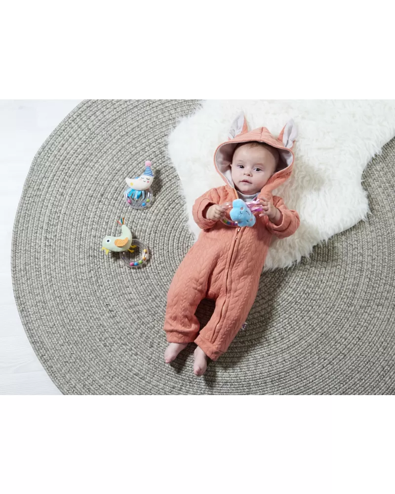 Chrastítko tvoří měkká plyšová hračka ve tvaru měsíčku a průhledný plastový kroužek naplněný barevnými korálky. Různé tvary a povrchy hračky podněcují dítě ke zkoumání rukama i ústy a pomáhají rozvíjet jemnou motoriku a smysly dítěte. Vhodné pro děti od narození.