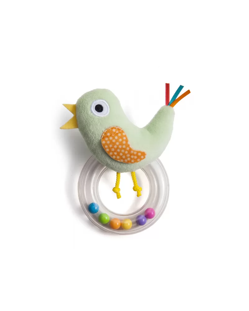 Chrastítko tvoří měkká plyšová hračka ve tvaru ptáčka a průhledný plastový kroužek naplněný barevnými korálky. Různé tvary a povrchy hračky podněcují dítě ke zkoumání rukama i ústy a pomáhají rozvíjet jemnou motoriku a smysly dítěte. Vhodné pro děti od narození.