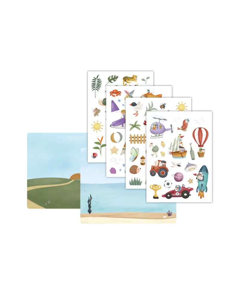 Snímatelné samolepky v podobě motivů ze života na farmě z kolekce Little Dutch Farma jsou určené pro použití na okně, zrcadle či na přiložené papírové čtvrtce s natištěným pozadím s mořským dnem. Samolepky lze snadno odlepit a použít opakovaně.