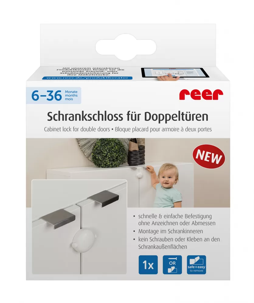 Obsah skříněk je pro děti obzvláště zajímavý. Jakmile se děti naučí lézt a chodit, snadno se mohou dostat k věcem, které do jejich rukou nepatří, jako např. ostré předměty nebo jedovaté čisticí prostředky. Pro ochranu dětí před podobným rizikem je velmi důležité zajistit skříňky zámkem s dětskou pojistkou. Zámek na skříňky od společnosti reer vám napomáhá zajistit bezpečí dítěte a velmi rychle a snadno se připevňuje pomocí přiložených montážních pomůcek.