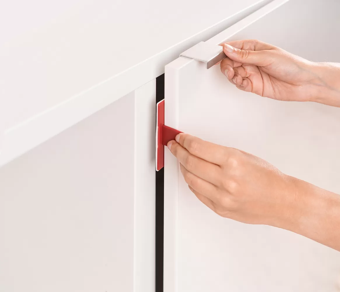 Součástí balení je praktická montážní pomůcka, díky které není nutné pracné měření a značení na nábytku a umožňuje přesné připevnění pro ještě více bezpečnosti. Jednoduše si zvolte typ upevnění dle vašeho nábytku, připojte zámek k upevňovacímu dílu, umístěte jej na skříňku, nalepte nebo přišroubujte jej - a to je všechno. Připevnění je skutečně snadné a navíc se provádí na vnitřní straně nábytku, takže vnější povrchy zůstanou netknuté.