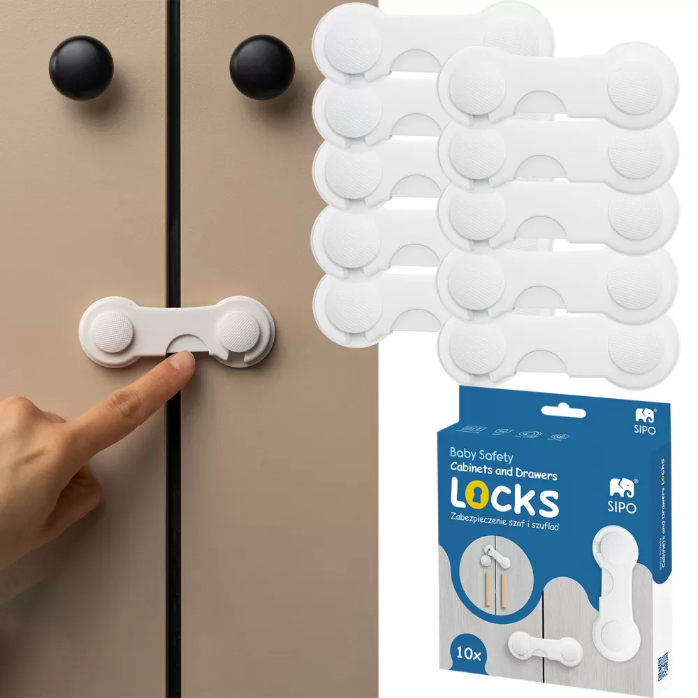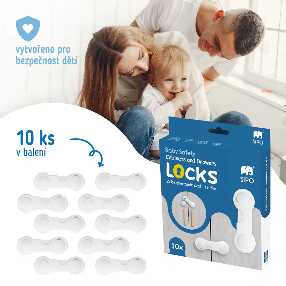 SIPO Sada obsahuje 10 ks bezpečnostních zámků na skříňky a zásuvky. Je ideálním řešením pro rodiče s malými dětmi, kteří pro ně chtějí vytvořit bezpečnou domácnost. Tyto bezpečnostní pomůcky se snadno používají a účinně chrání před náhodným otevřením nábytku.