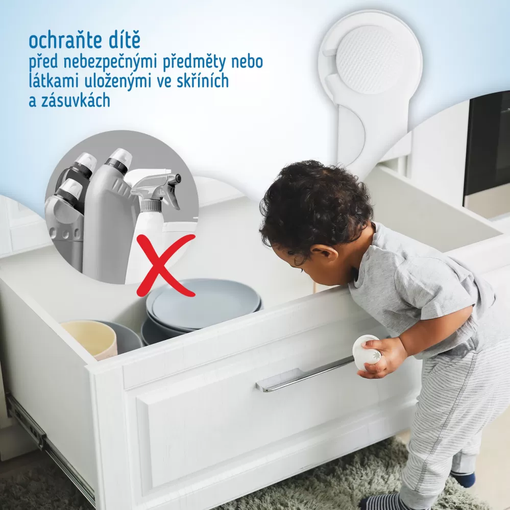 DOPLŇUJÍCÍ INFORMACE: Vždy postupujte podle přiložených pokynů. Pomůcka je určena pro domácí použití. Nepoužívejte výrobek jiným způsobem, než pro jaký byl určen a jaký je popsán v přiložených pokynech. Výrobce neodpovídá za škody vzniklé v důsledku použití výrobku v rozporu s jeho určením. Upozorňujeme, že některé děti mohou ochranu odstranit. Z tohoto důvodu doporučujeme pravidelně kontrolovat stav bezpečnostní pomůcky – zámku.