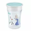Hrneček NUK Magic Cup Frozen Elsa 230 ml umožňuje malým dětem pít jako velké děti. 360° pitný okraj podporuje a pomáhá pít ze všech stran – žádná držátka a pití téměř jako z normálního hrnečku. Jediný „kouzelný rozdíl“ je ten, že tekutina z hrnečku nevyteče díky silikonovému disku, který utěsňuje víčko zevnitř. Pití je dětská hra – stačí jednoduše sát okraj hrnečku.