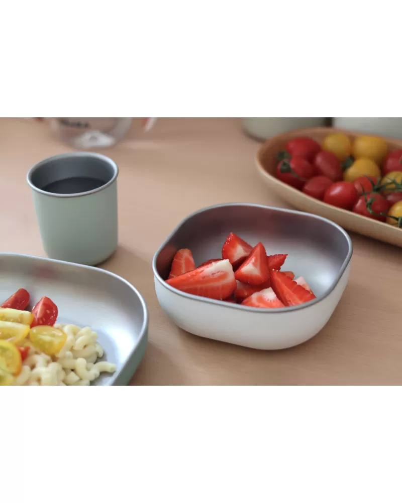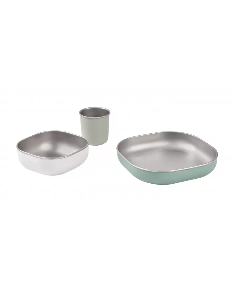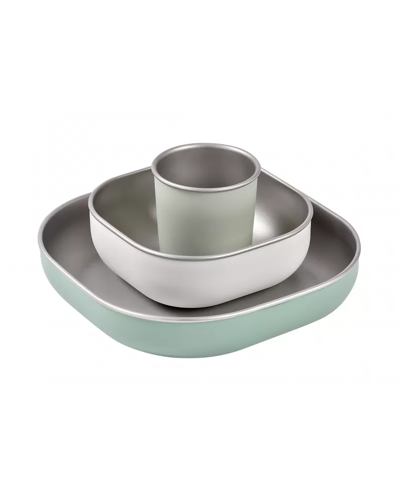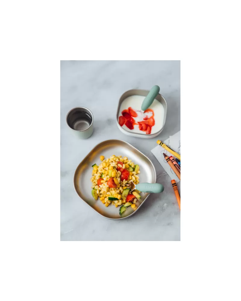 Jídelní sadu inovativního nerezového nádobí se silikonovou povrchovou vrstvou tvoří talíř, miska a kelímek. Ergonomický tvar s vysokými stranami a zaoblenými rohy jsou ideální pro učení dětí samostatnému stolování. Silikonový povrch nádobí pomáhá, aby nádobí neklouzalo na stole ani v ruce.