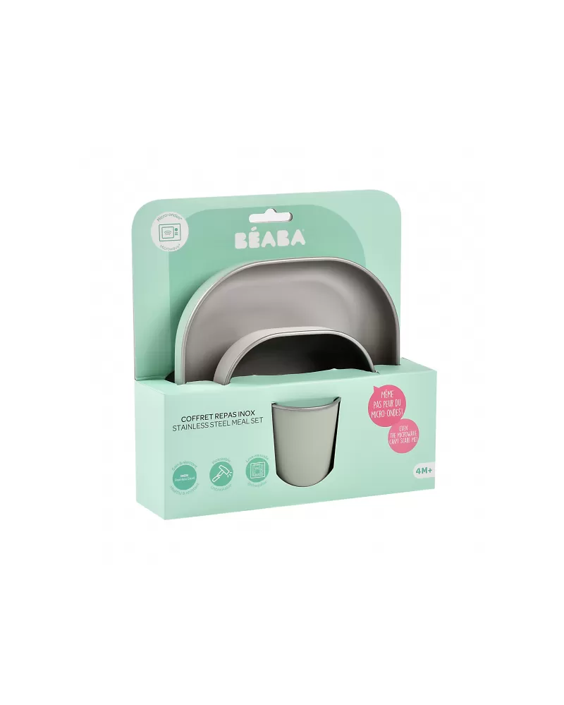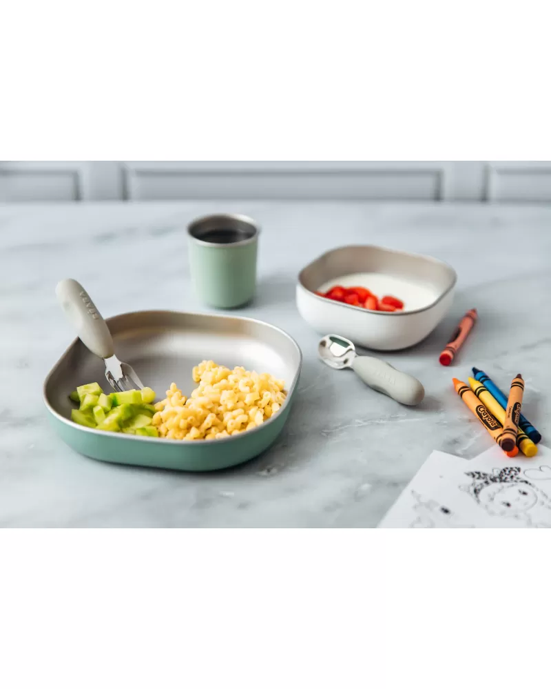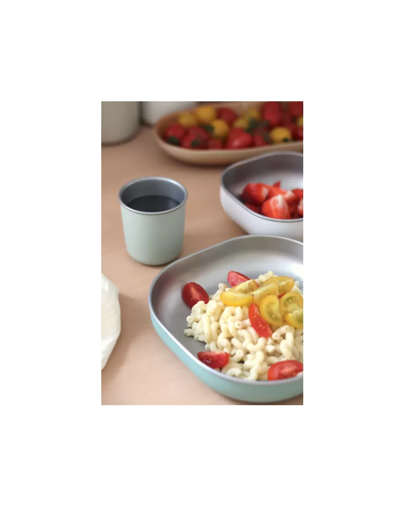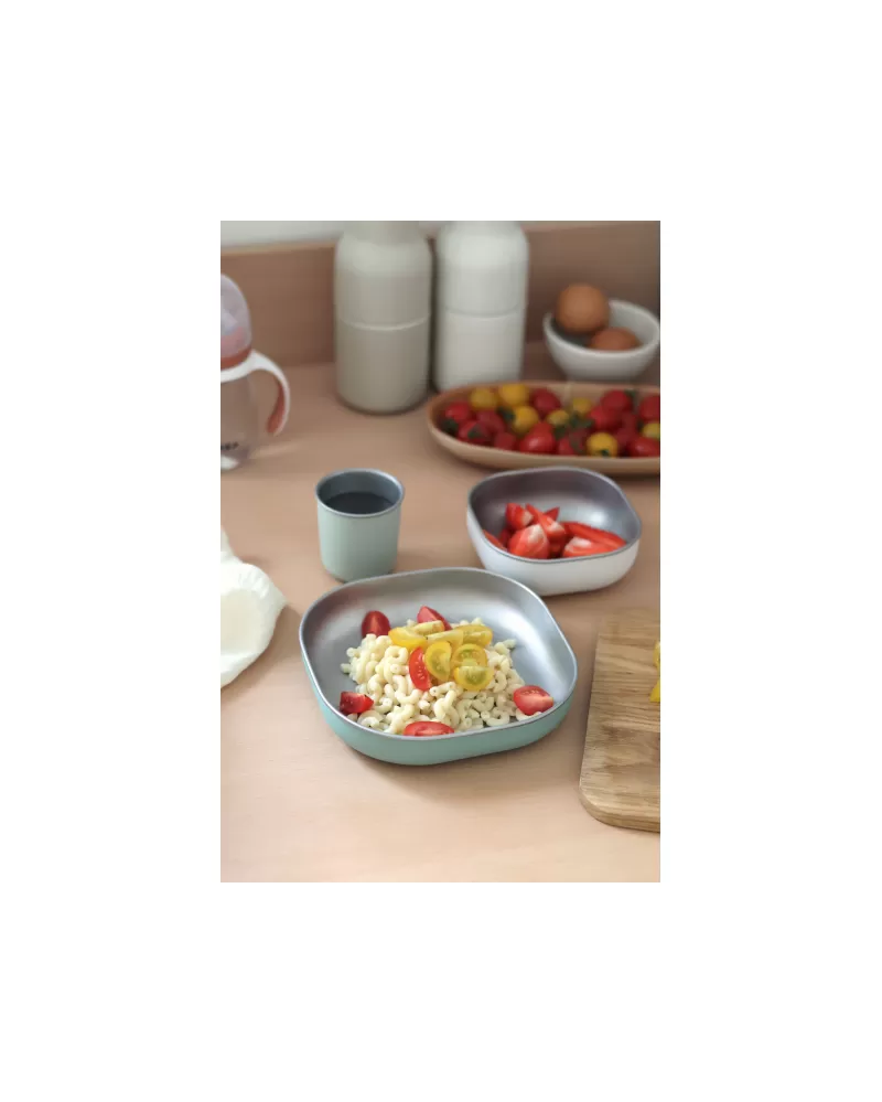 Jídelní sadu inovativního nerezového nádobí se silikonovou povrchovou vrstvou tvoří talíř, miska a kelímek. Ergonomický tvar s vysokými stranami a zaoblenými rohy jsou ideální pro učení dětí samostatnému stolování. Silikonový povrch nádobí pomáhá, aby nádobí neklouzalo na stole ani v ruce.