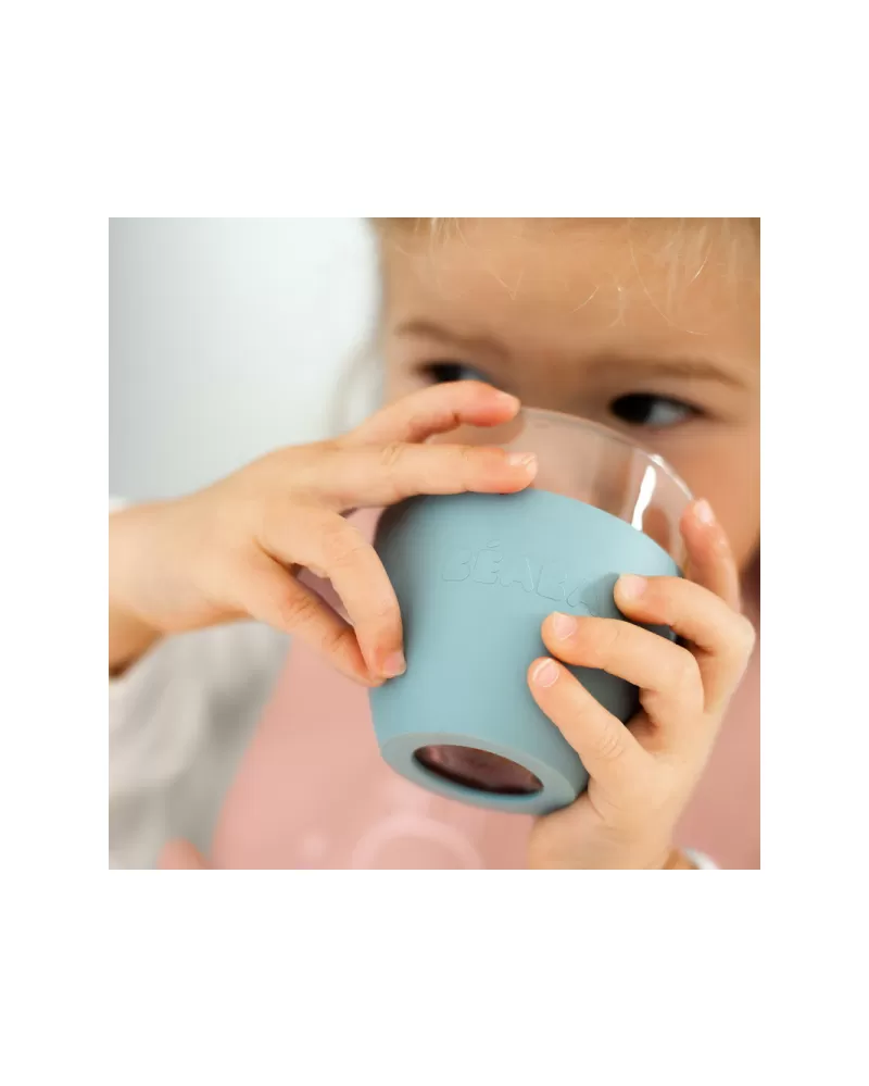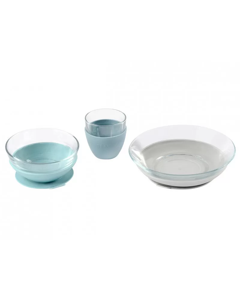 Unikátní sadu nádobí z tvrzeného skla tvoří jídelní miska, talířek a sklenička ergonomického, zaobleného tvaru s hladkými hranami. Miska a talíř jsou doplněny speciálními odnímatelnými podložkami z pružného materiálu s přísavkou, která zajišťuje stabilitu misky či talíře na stole a usnadňuje dítěti stolování. Návlek na skleničku ze stejného materiálu usnadňuje dítěti uchopení skleničky a snižuje riziko jejího vyklouznutí z ruky.