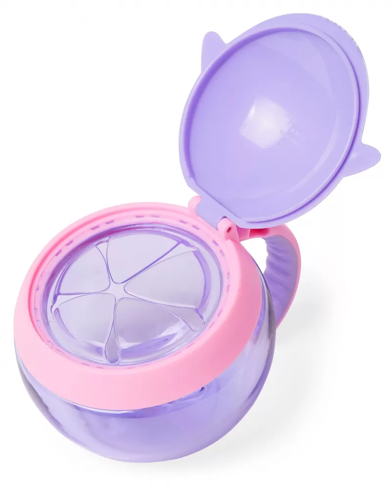 Chytrý nápad na cesty. Kalíšek má víčko, které po otevření drží, před vysypáním obsahu jej chrání pružné lamely, které pustí dětskou ručičku dovnitř, ale nepustí svačinku ven. Kalíšek je průhledný, aby se mohl zavčasu doplnit. Na boku je praktické ouško v dětském rozměru, pomocí kterého lze kalíšek připevnit i na kočárek či tašku. 0 % BPA, 0 % PVC, bez ftalátů. Obsah: 222 ml. Průměr: 10 cm Rozměry produktu: 12 cm x 9,4 cm x 8,8 cm