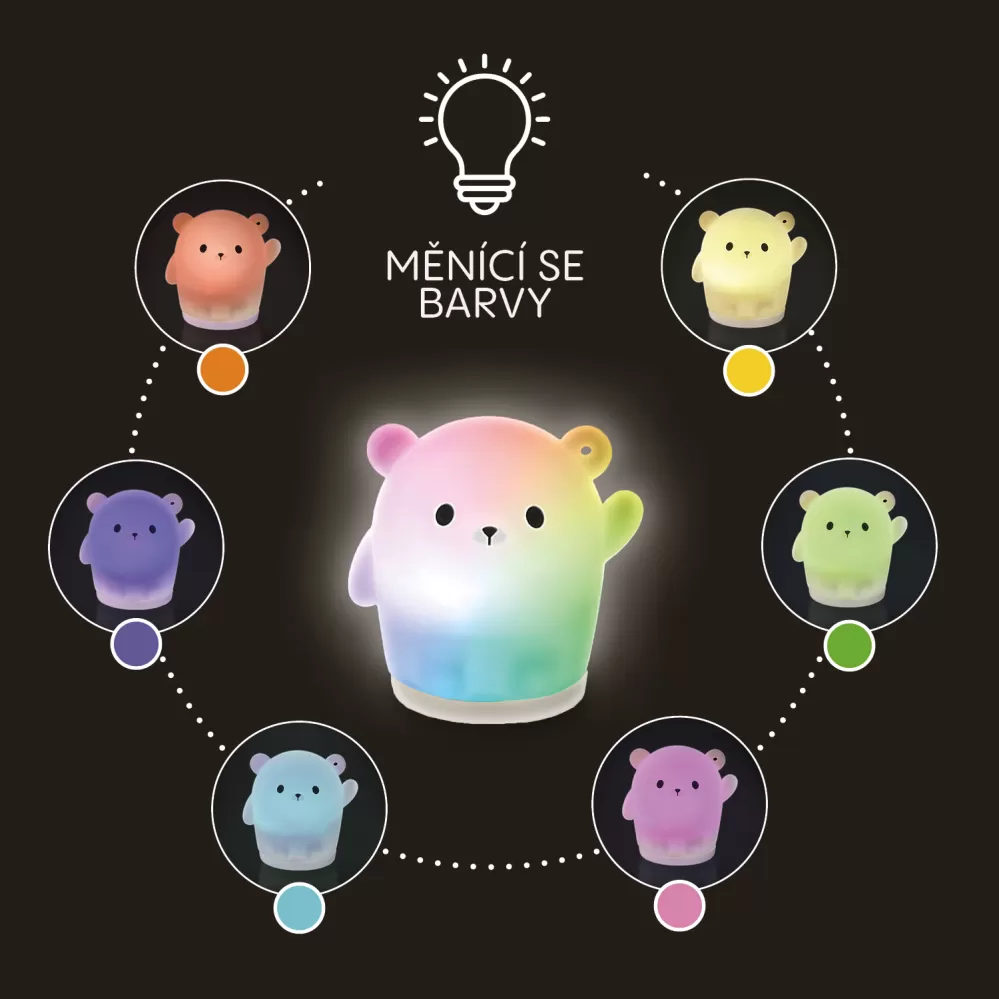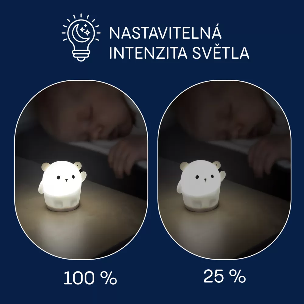 Silikonové světýlko je vybaveno stmívatelným bílým světlem, které snadno přizpůsobíte aktuálním potřebám. Pro vytvoření hravější atmosféry umožňuje plynulé přechody mezi barvami, které lze snadno měnit jemným poklepáním, případně zastavit na oblíbené barvě. Díky světýlku se bude děťátko cítit bezpečně.