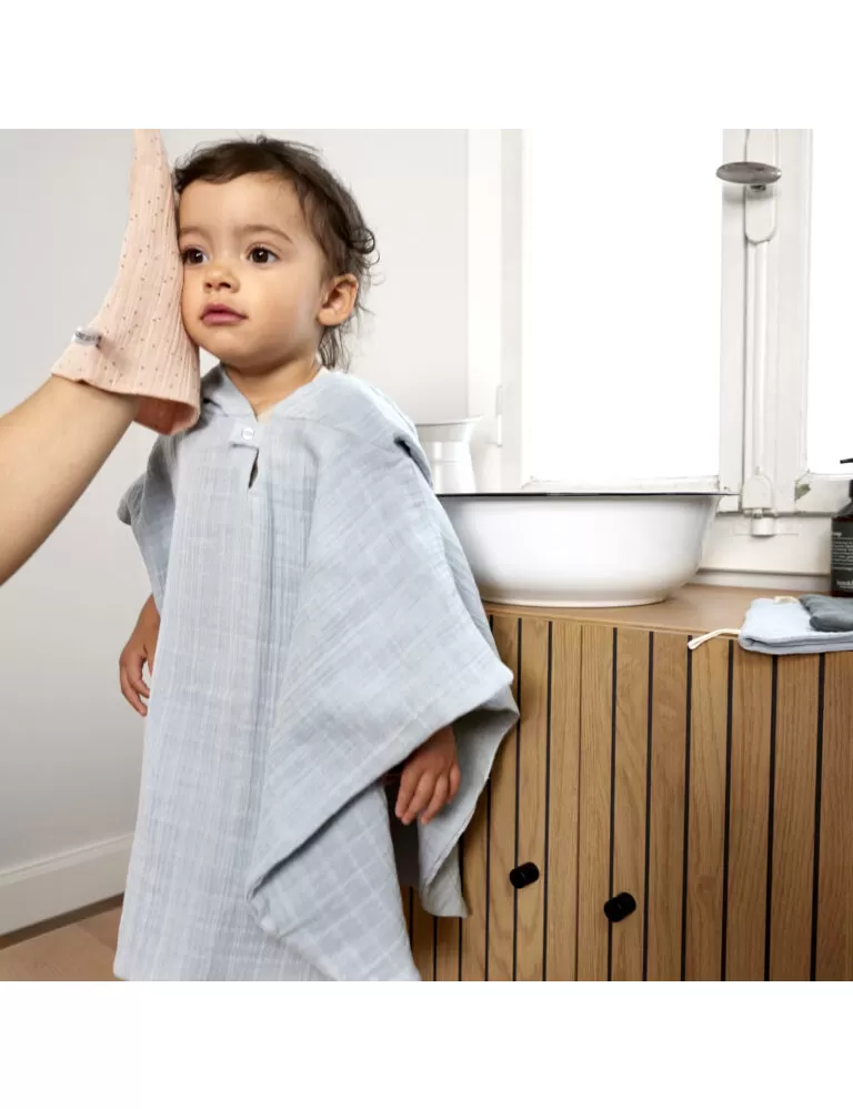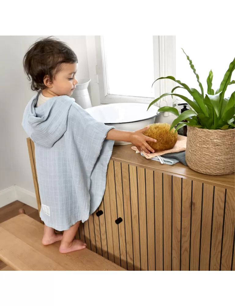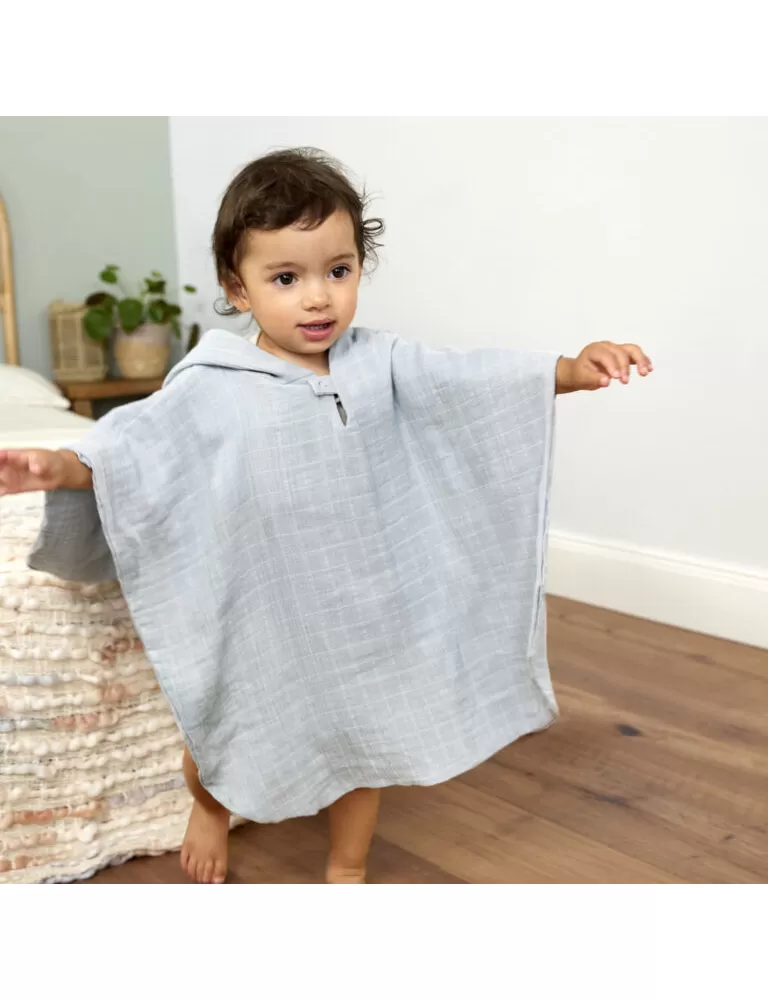 Poncho je vyrobené z dvouvrstvého předepraného mušelínu, který je prodyšný a jemný k dětské pokožce. Kapuce chrání hlavu a krk dítěte a udržuje je tak v teple. Poncho je ideální jak pro každodenní domácí koupel, tak pro plavání v bazénu, či pobyt na pláži. Je určeno dětem od 1 roku do 3 let věku.