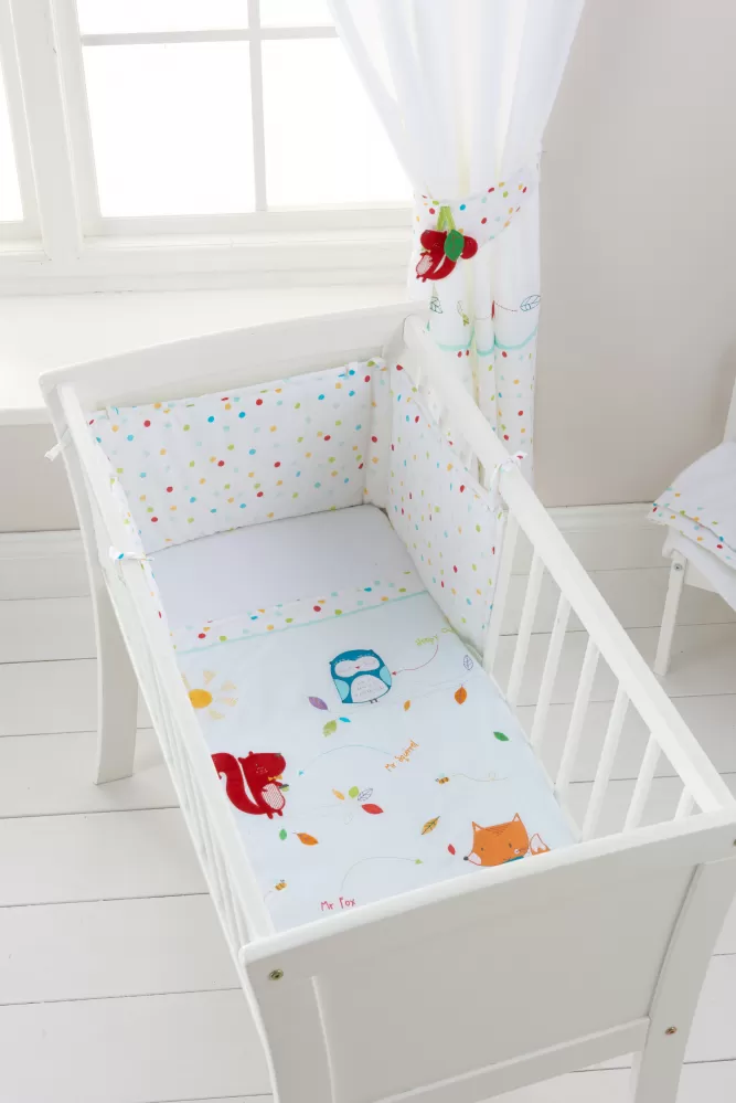 Součástí sady do kolébky nebo malé postýlky je přikrývka (60x70cm), mantinel (25x120cm) a napínací prostěradlo (39,5x88,5cm).