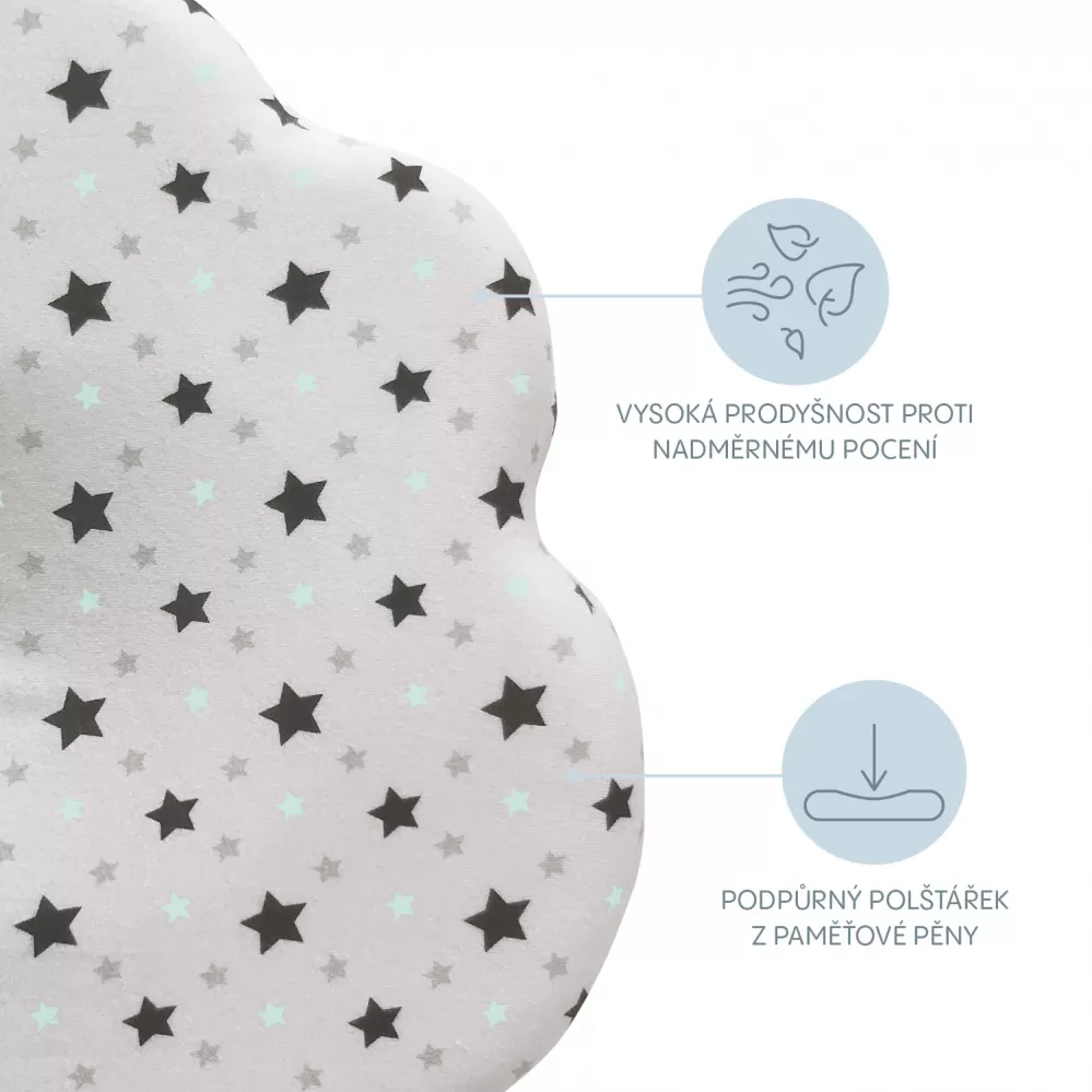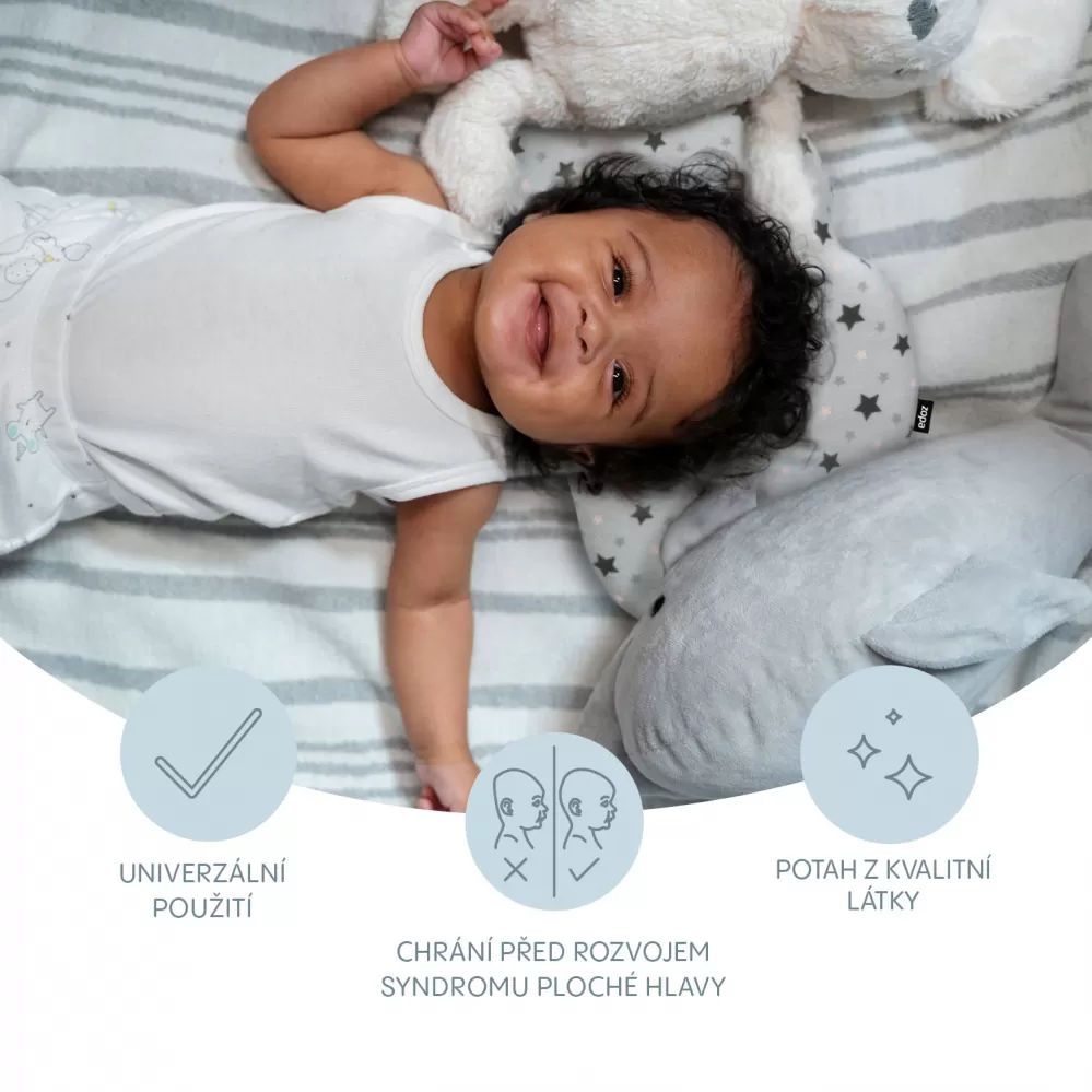 Poskytněte svému miminku co největší komfort. Měkký polštářek s hvězdičkami je vyroben z měkké paměťové pěny, která se přizpůsobí tvaru hlavy miminka. Střední část je navržena tak, aby chránila kojence před rozvojem syndromu ploché hlavy. Polštářek můžete použít v postýlce, kočárku i autosedačce.