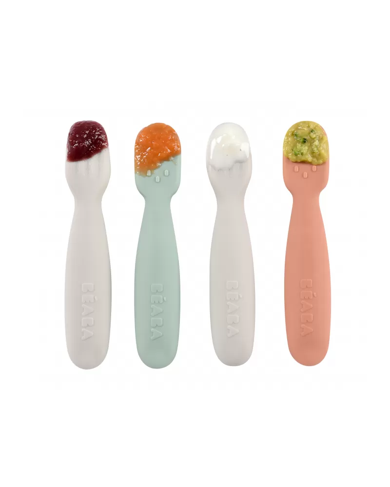 Lžičky jsou vhodné od 4 měsíců pro krmení dítěte rodičem, od 6-8 měsíců již dítě může lžičku držet samo. Krátká, zaoblená rukojeť umožňuje dítěti snadné uchopení v dlani i prsty. Ploché oboustranné provedení lžičky zajistí, že příkrm, který dítě na lžičku nabere, dokáže donést až do úst.