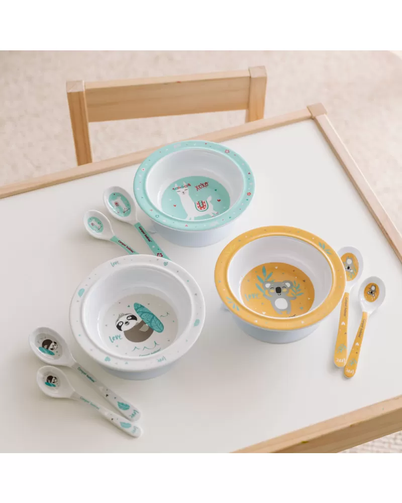Sada lžiček na krmení z oblíbené kolekce EXOTIC ANIMALS. Vyrobeny z melaminu, materiálu odolného proti poškrábání. Zaoblené tvary nedráždí jemné dětské dásně. Lžičky mají barevné potisky, které jsou pro děťátko dalším lákadlem během jídla. Sada se skládá ze dvou čajových lžiček: malá a velká. Vhodné pro děti 9-ti měsíců. Lze umývat v myčce na nádobí, neobsahují BPA. Vyrobeno z melaminu - odolného proti poškrábání. Zaoblený tvar – nedráždí jemné dásně děťátka. Menší lžička je perfektní při rozšiřování jídelníčku děťátka, větší při učení samostatného krmení.