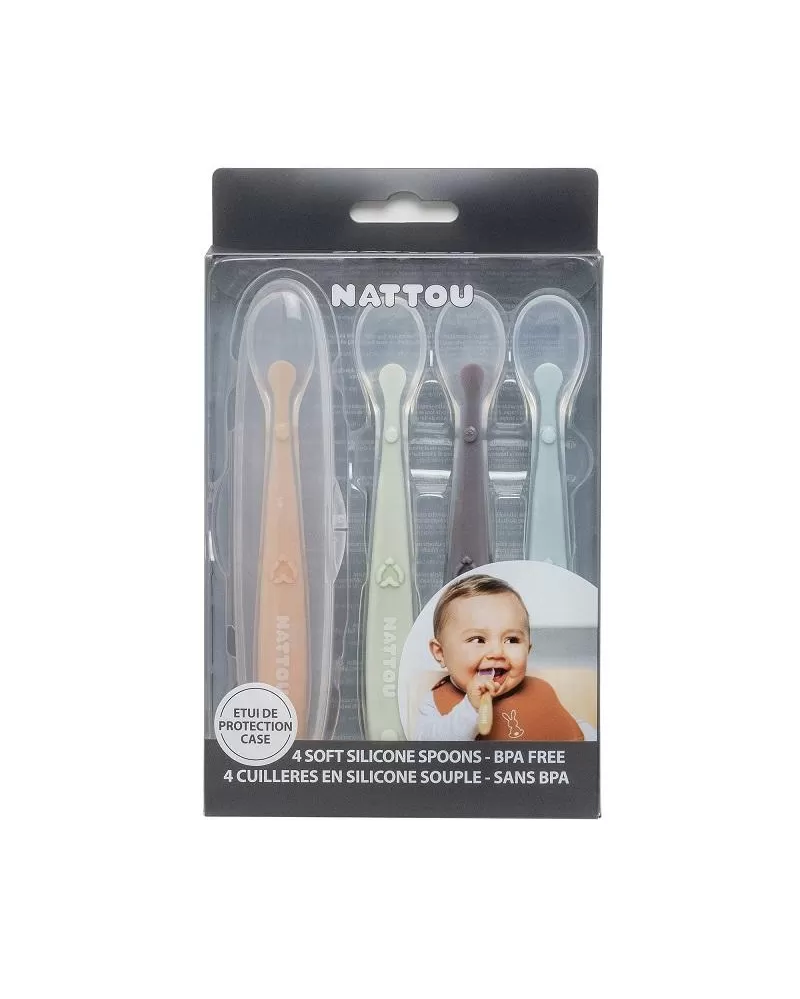Set 4 lžiček od Nattou z měkkého a ohebného silikonu, které zajišťují jednodušší stravování pro vaše dítě. Lžičky jsou díky měkkosti a flexibilitě šetrné k dásním. Vlastnosti: - Sada obsahuje 4 ks. - Lžičky jsou v příjemných barvách Mix & Match. - Vyrobeno ze 100% silikonu speciálně upraveného tak, aby nedráždily křehké dásně dítěte díky extra měkké a pružné silikonové špičce. - Sada je dodávána s jedním pouzdrem, takže si můžete lžičku vzít i na cesty. Takto chráněná lžička snadno vklouzne do vaku, aniž hrozilo znečištění nebo poškození. - materiál: 100% silikon bez BPA - rozměry: délka 16 cm - čištění: mytí ručně nebo v myčce nádobí