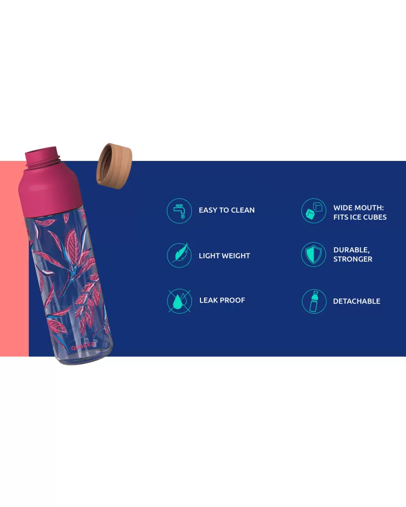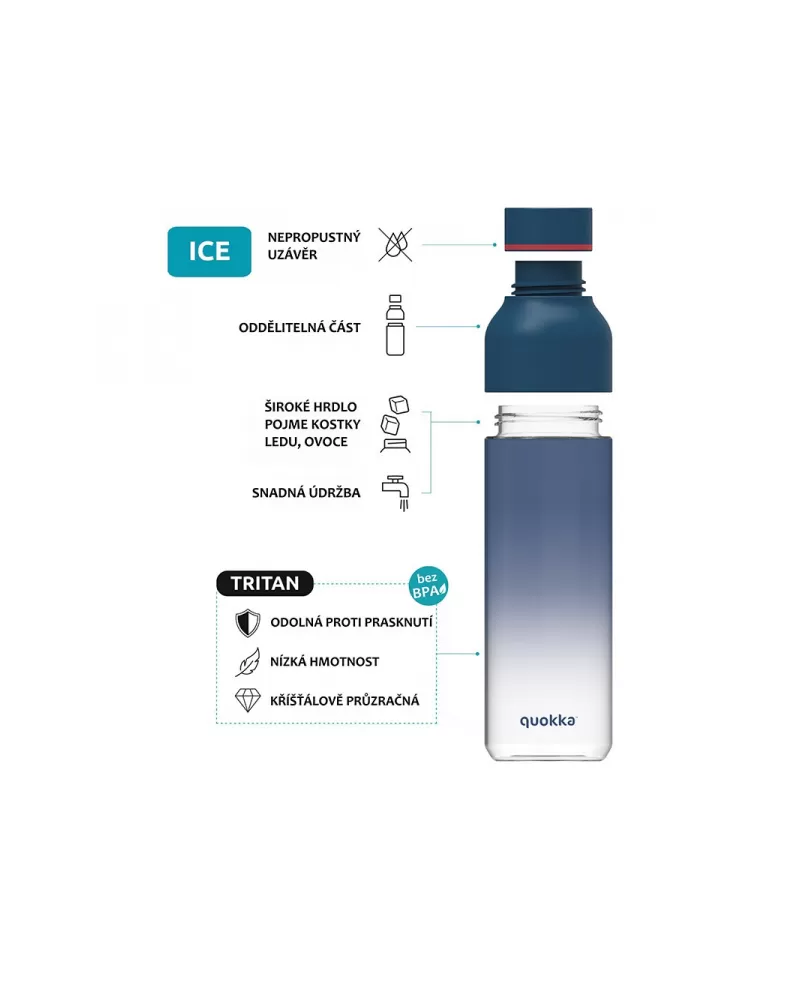 Láhev Quokka Ice s dvojitým otevíráním umožňuje vložení kostek ledu či kousků ovoce a zároveň se snadno čistí. 100% těsnicí, šroubovací uzávěry chrání obsah láhve před vylitím.