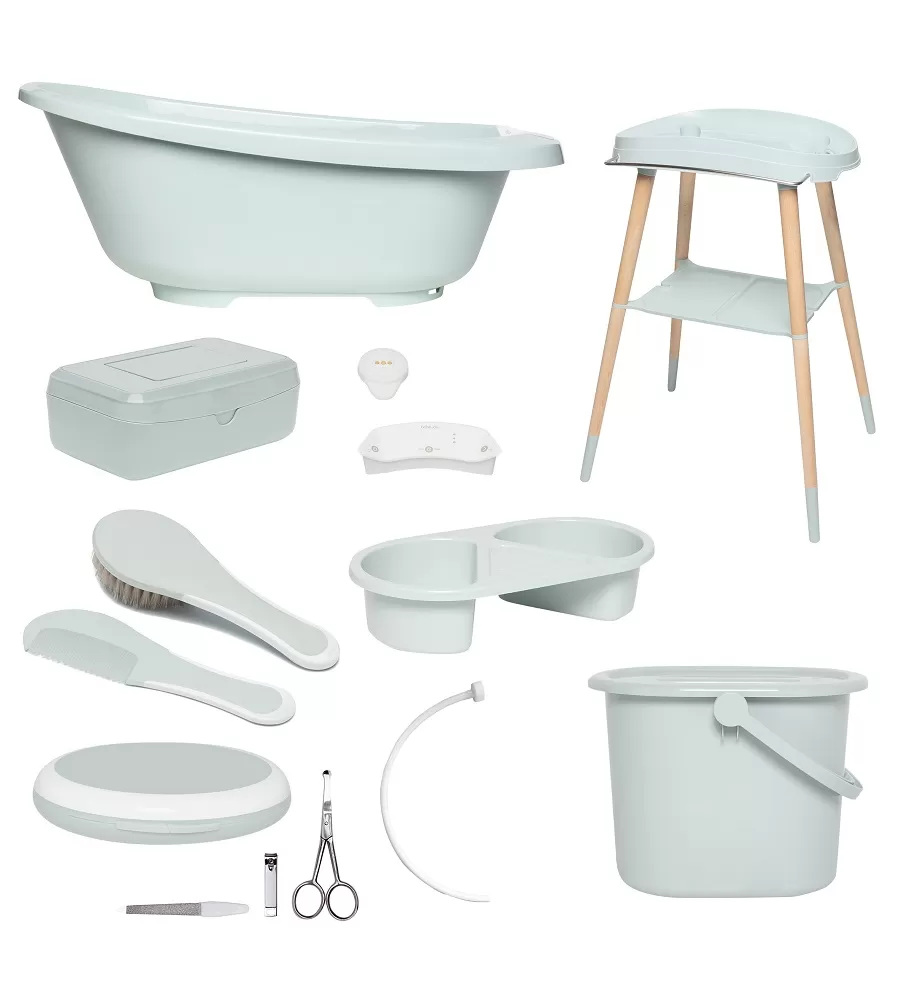 Sada obsahuje: digitální vaničku Sense Edition a luxusní stojan z lakovaného buku, kyblík na plenky, sadu na manikúru, hřeben a kartáč, misku na mytí, box na vlhčené ubrousky a vypouštěcí hadici. Zkrátka vaše kompletní vybavení pro péči a koupání!
