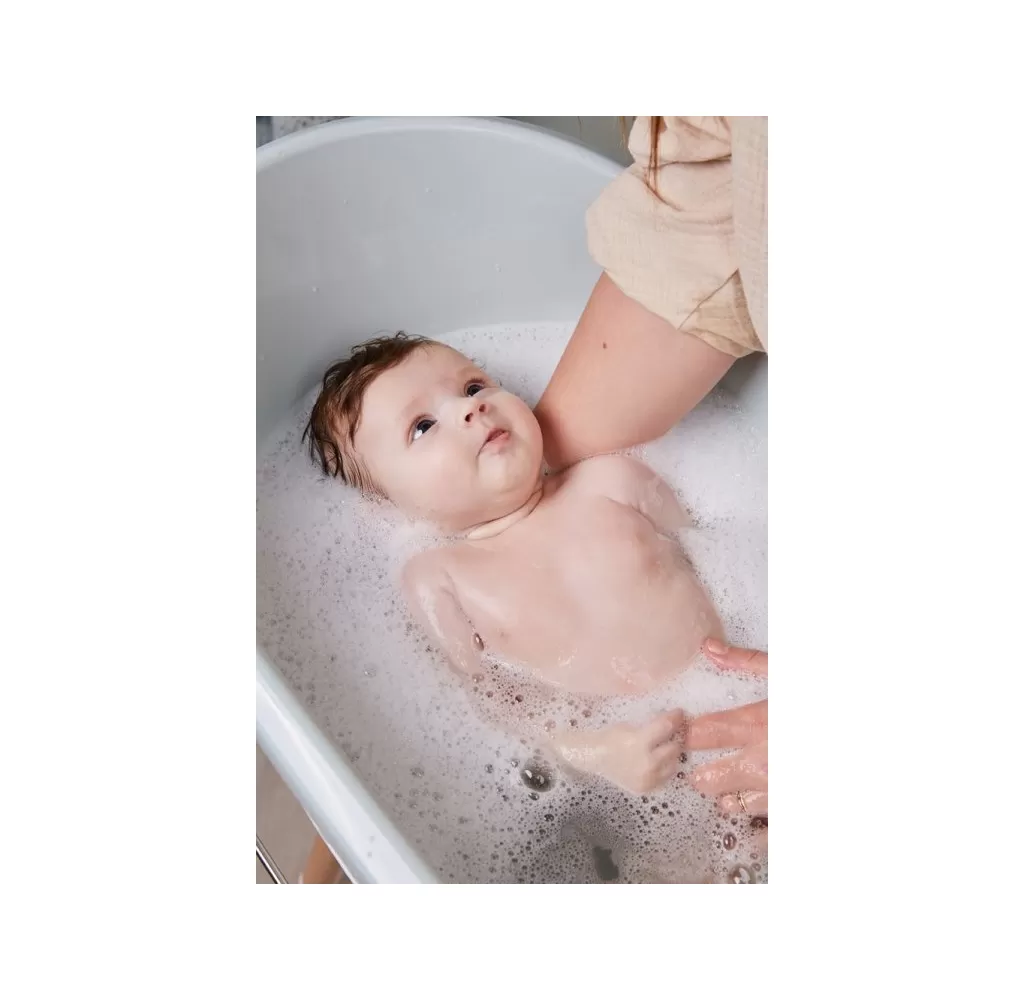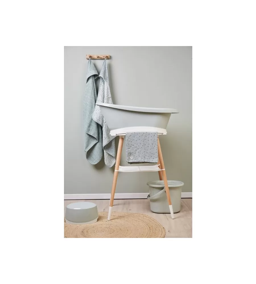 Velmi stabilní vanový stojan Sense má nohy vyrobené z lakovaného bukového dřeva s certifikací FSC. To dodává stojanu teplý moderní vzhled. Je vybaven praktickými pomůckami; vpředu je připevněn držák na ručníky. Prostorná plastová polička poskytuje dostatek místa například pro šampon, žínku, vodní hračky nebo koupací gel. To znamená, že máte po ruce všechny potřebné věci, abyste si s malým mohli v klidu koupání užít. Inovativní systém upevnění zajišťuje, že vanu lze snadno připevnit ke stojanu a stejně snadno sejmout. Po kliknutí můžete své miminko nerušeně a bezpečně koupat.