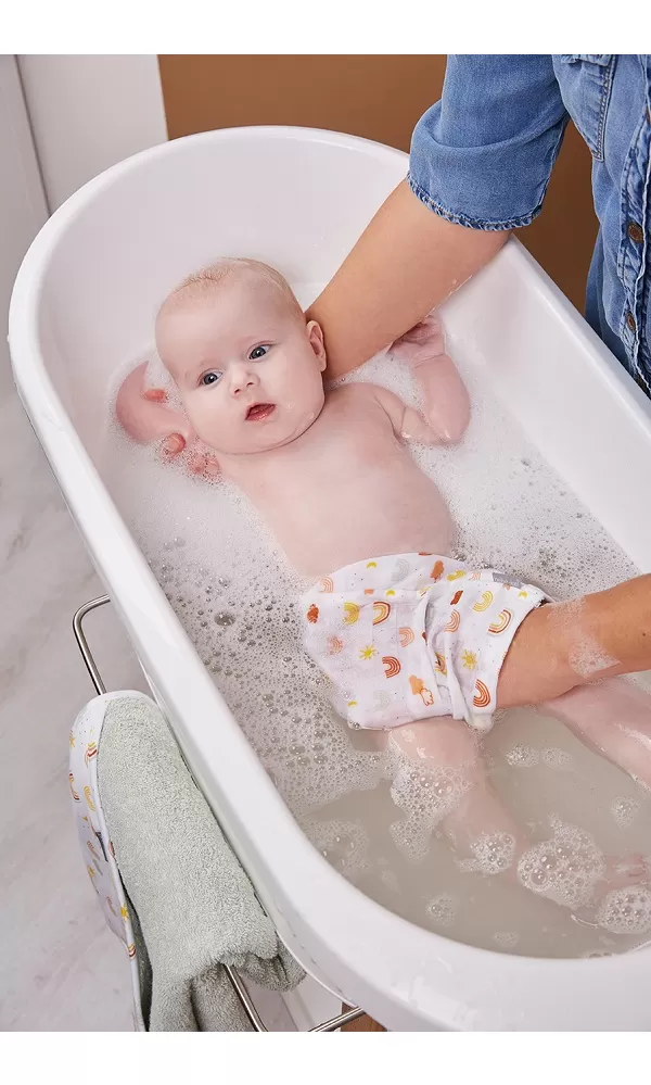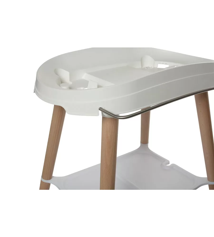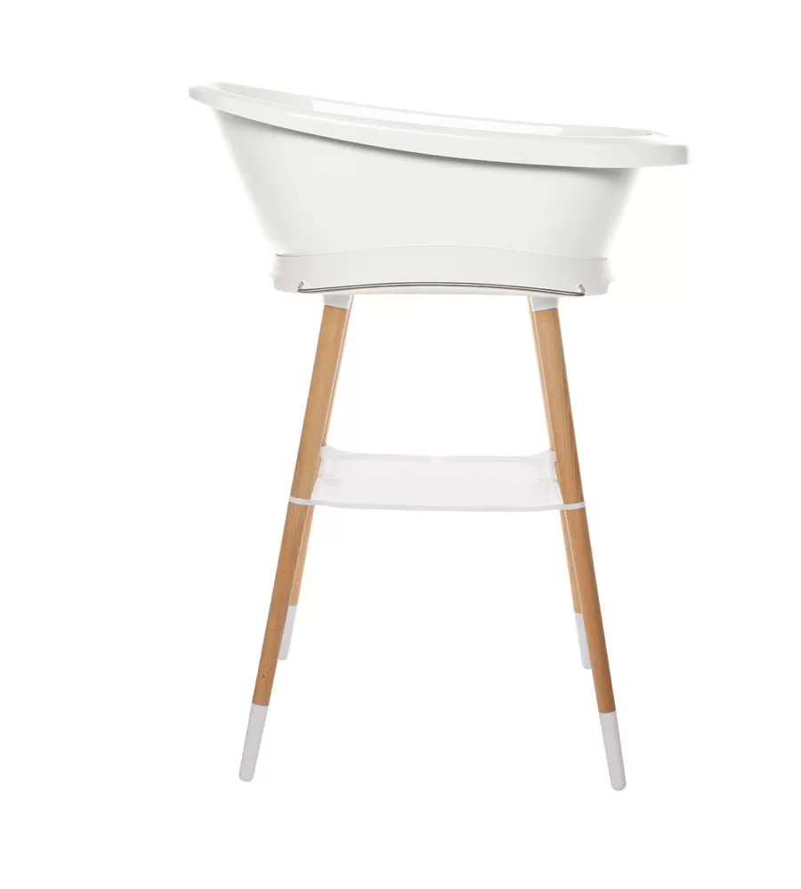 Velmi stabilní vanový stojan Sense má nohy vyrobené z lakovaného bukového dřeva s certifikací FSC. To dodává stojanu teplý moderní vzhled. Je vybaven praktickými pomůckami; vpředu je připevněn držák na ručníky. Prostorná plastová polička poskytuje dostatek místa například pro šampon, žínku, vodní hračky nebo koupací gel. To znamená, že máte po ruce všechny potřebné věci, abyste si s malým mohli v klidu koupání užít. Inovativní systém upevnění zajišťuje, že vanu lze snadno připevnit ke stojanu a stejně snadno sejmout. Po kliknutí můžete své miminko nerušeně a bezpečně koupat.