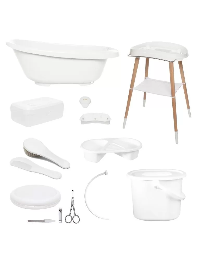 Sada obsahuje: digitální vaničku Sense Edition a luxusní stojan z lakovaného buku, kyblík na plenky, sadu na manikúru, hřeben a kartáč, misku na mytí, box na vlhčené ubrousky a vypouštěcí hadici. Zkrátka vaše kompletní vybavení pro péči a koupání!