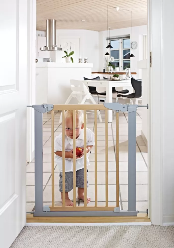 Zábranu Baby Dan lze namontovat i na kulaté povrchy (zábradlí atd.). Vyžaduje dokoupení volitelného příslušenství. Vyrobeno v Dánsku.