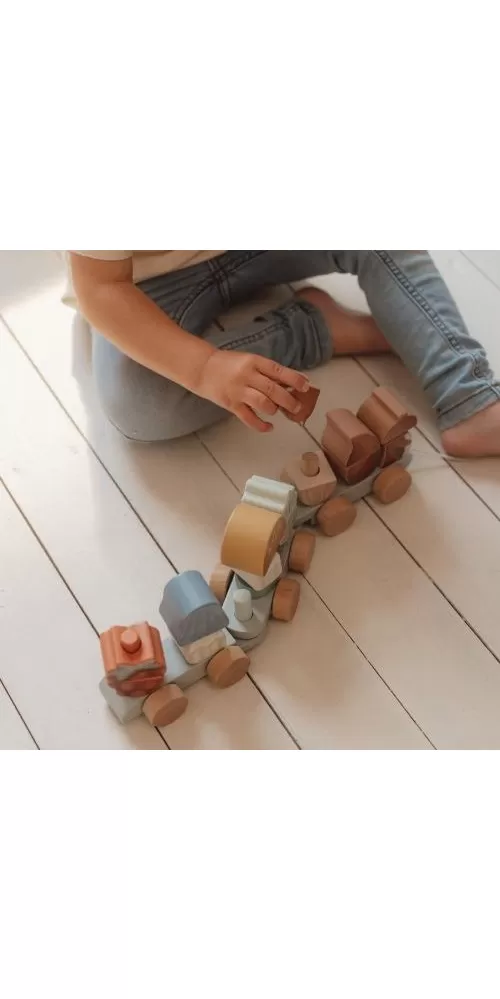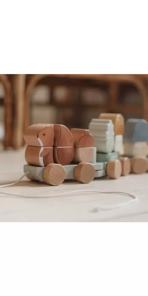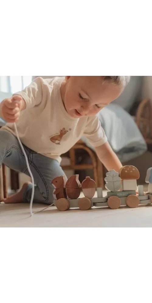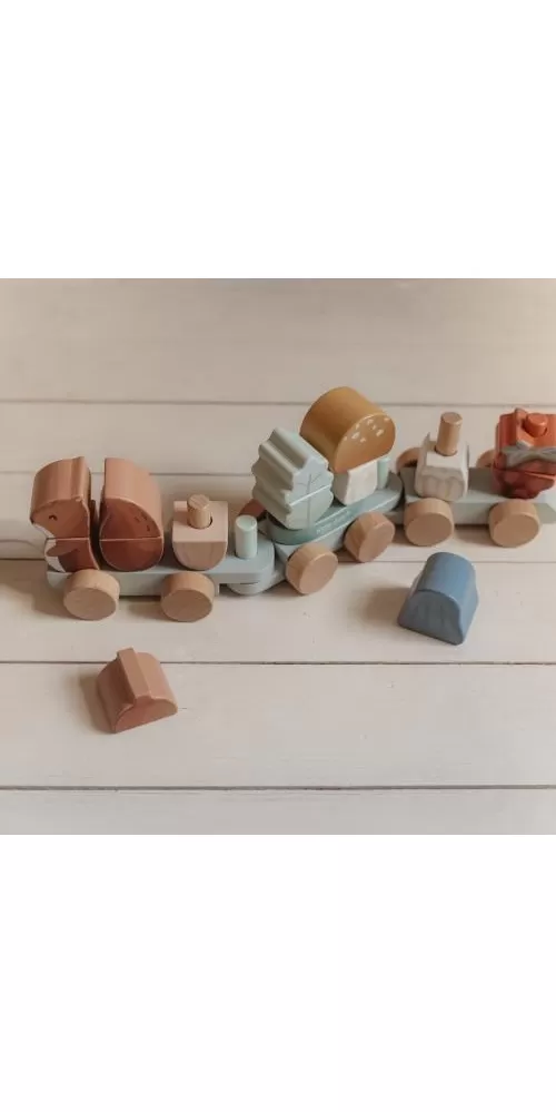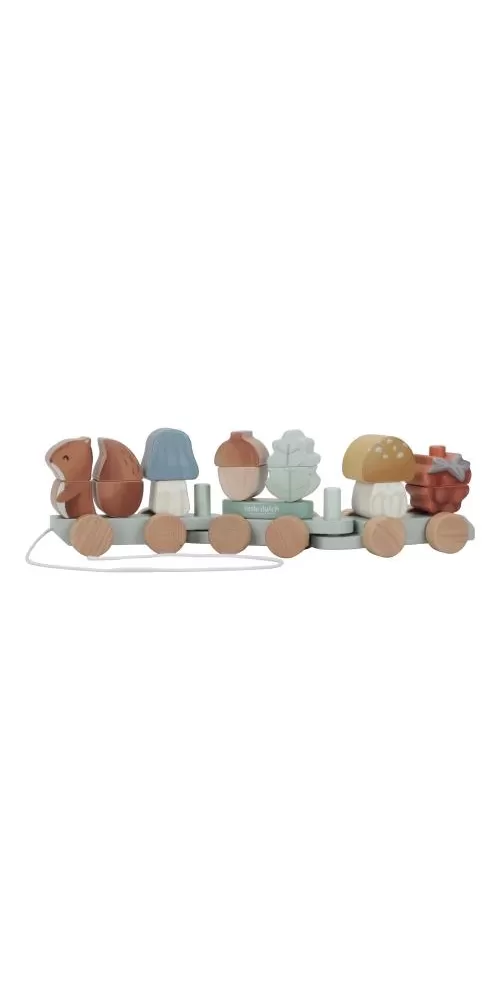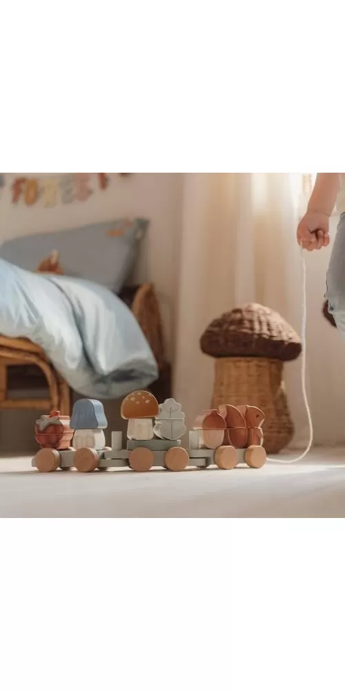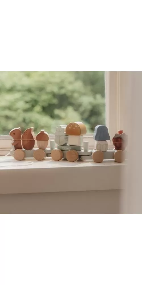 Originální dřevěný vláček z dílny Little Dutch je tvořen kostkami různých barev ve tvaru veverky, hub, maliny a listu. Kombinováním kostek si vaše dítě může sestavovat různé varianty vagónů dle své fantazie.