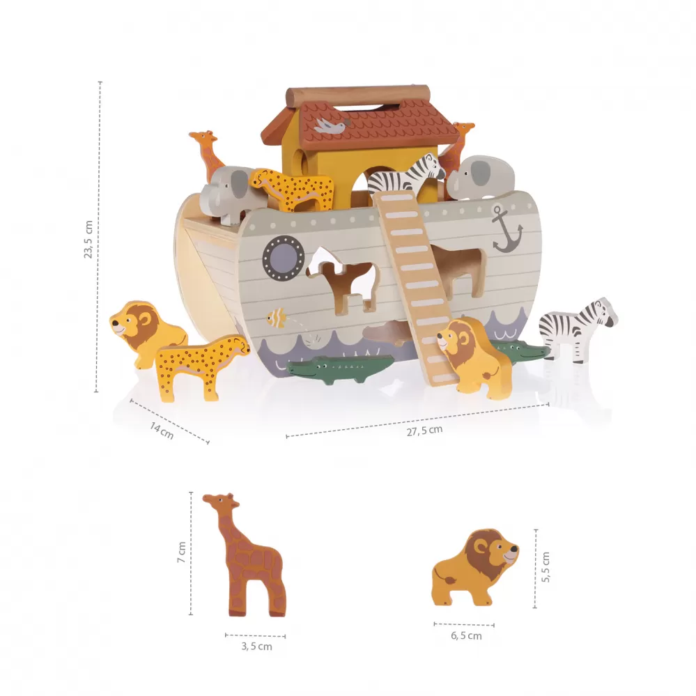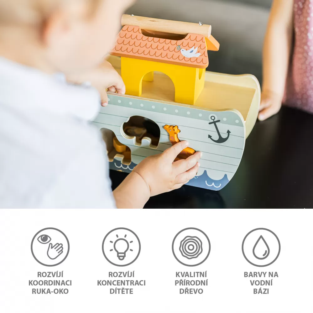 Dopřejte svému malému dobrodruhovi zachránit říši zvířat, tak jako to stojí v biblickém příběhu o Noemovi a arše. Dřevěná vkládačka rozvíjí koordinaci ruka-oko, logické myšlení, představivost a učí rozpoznávat zvířátka.