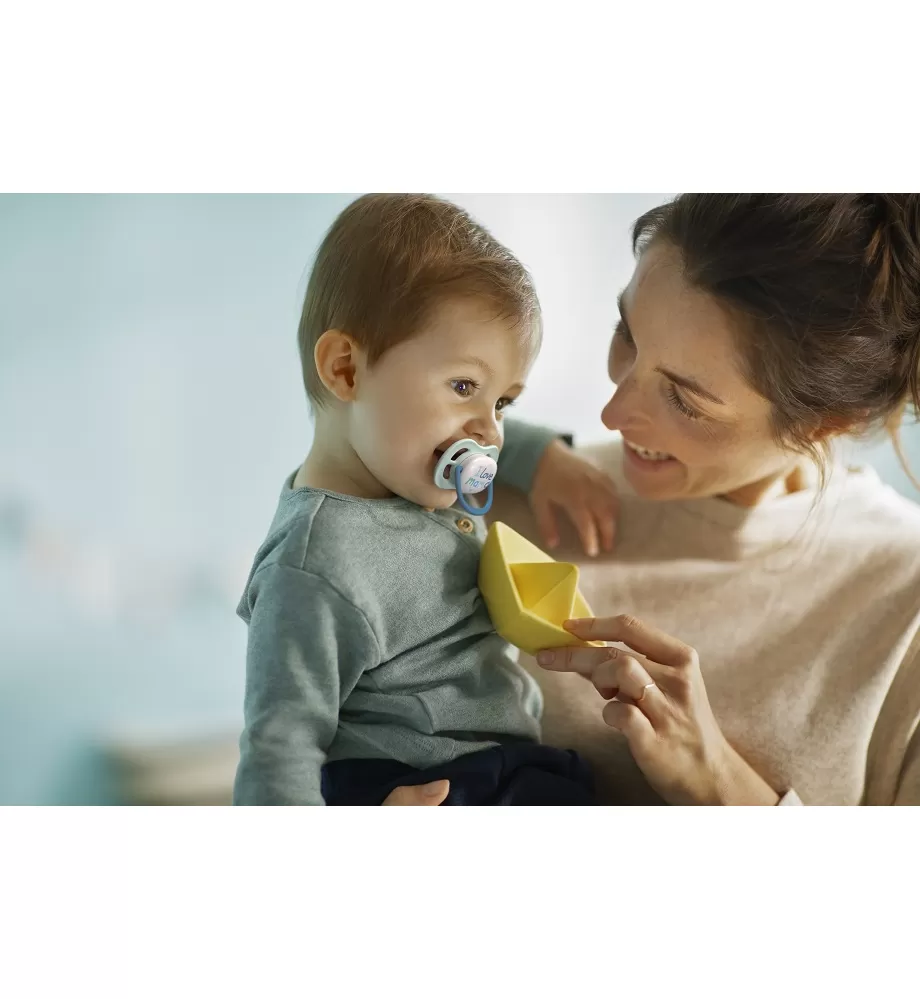 Kojenecký silikonový dudlík Ultra air Text Avent s obrázkem pro děti 0 - 6 měsíců. Nové dudlíky ultra air nabízí miminkům ještě větší komfort. Byly navrženy pro maximální pohodlí dítěte. Sání miminka uklidňuje. Miminka s dudlíkem klidněji spí, méně se ve spánku pohybují a především zůstávají ležet na zádech, což je doporučováno pediatry. Používání dudlíku zmenšuje závislost miminka na láhvi, snižuje možnost poškození zubů a může snížit riziko dentálních problémů v pozdějším věku ve srovnání s dlouhodobým cucáním palců, které vytvářejí nevhodný tlak na patro a přední zuby. Kotouč má extra velké otvory, přes které může pokožka miminka lépe dýchá, je lehký a má zaoblené okraje, které zajistí pohodlí dítěte. Ortodontický, stlačitelný a symetrický sosák AVENT podporuje správný vývoj zubů a ústní dutiny. Neobsahuje BPA. V balení 2 ks.