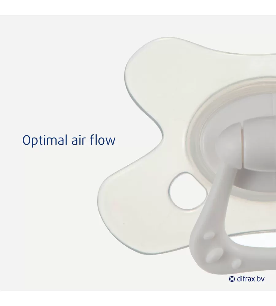 Unikátní dudlík Difrax má kotouč ve tvaru motýla, dokonale tak padne tvaru obličeje vašeho miminka. Vykrojení kotouče umožňuje miminku volné dýchání nosem. Dva přídavné otvory zabezpečují dostatečný průchod vzduchu, čímž omezují možnost podrážení pokožky miminka. Dudlík dodává miminku pocit pohodlí, útěchy a uvolnění. Difrax dudlíky jsou navíc dostupné v několika populárních provedeních a v různých barvách.