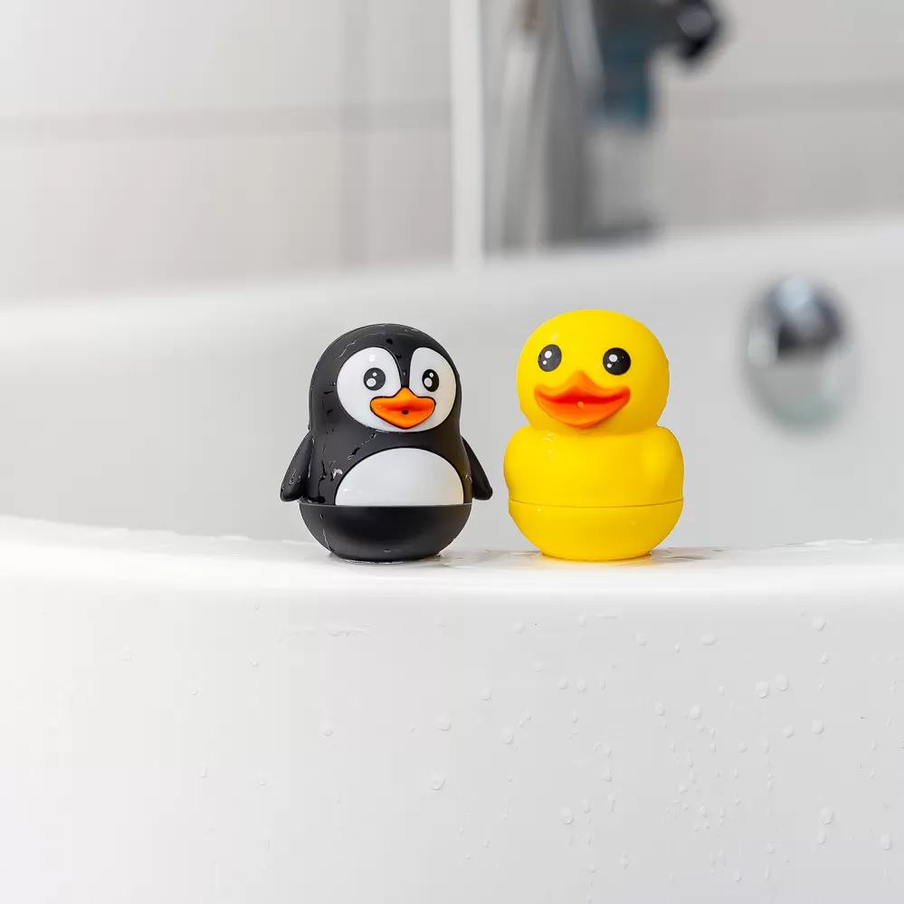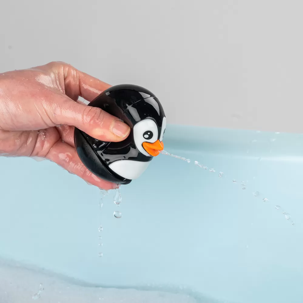 Ideální pro cákání se ve vodě, 2 způsoby stříkání vody: ze zobáku nebo z těla. Části lze rozebrat pro snadné čištění a hygienické sušení. Materiál: silikon, obsah: 2 kusy (1x kačenka, 1x tučňák).