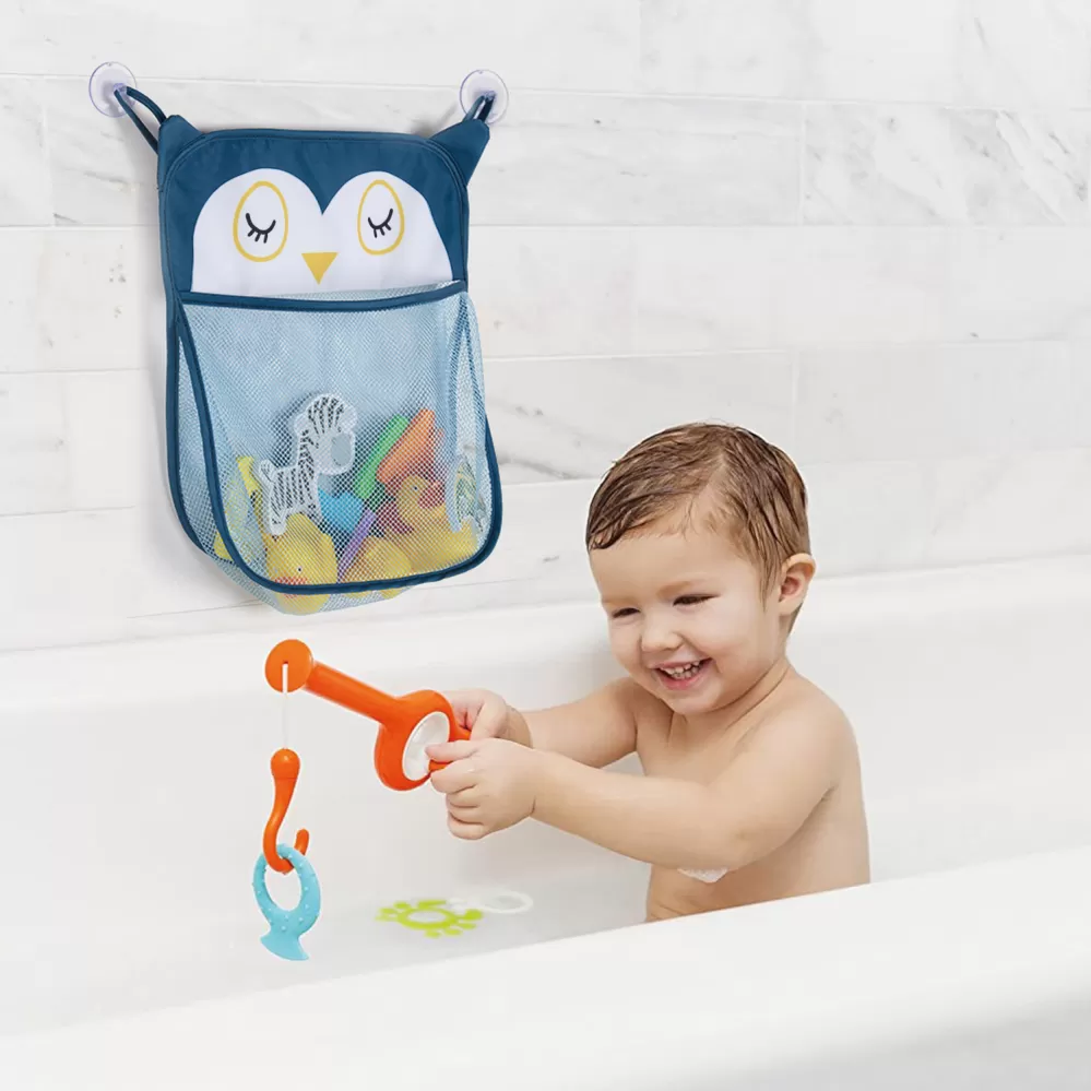 Organizér, který zajistí, že koupelna bude vždy uklizená. Díky dvěma přísavkám lze organizér připevnit na stěnu v koupelně. Síťovaná kapsa je prodyšná a umožňuje hračkám proschnout do dalšího koupání. Celková velikost 32×38 cm.