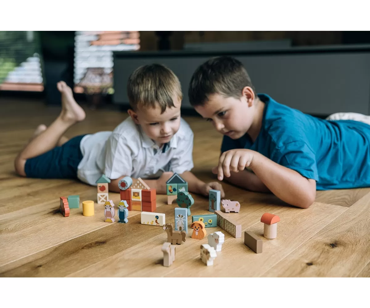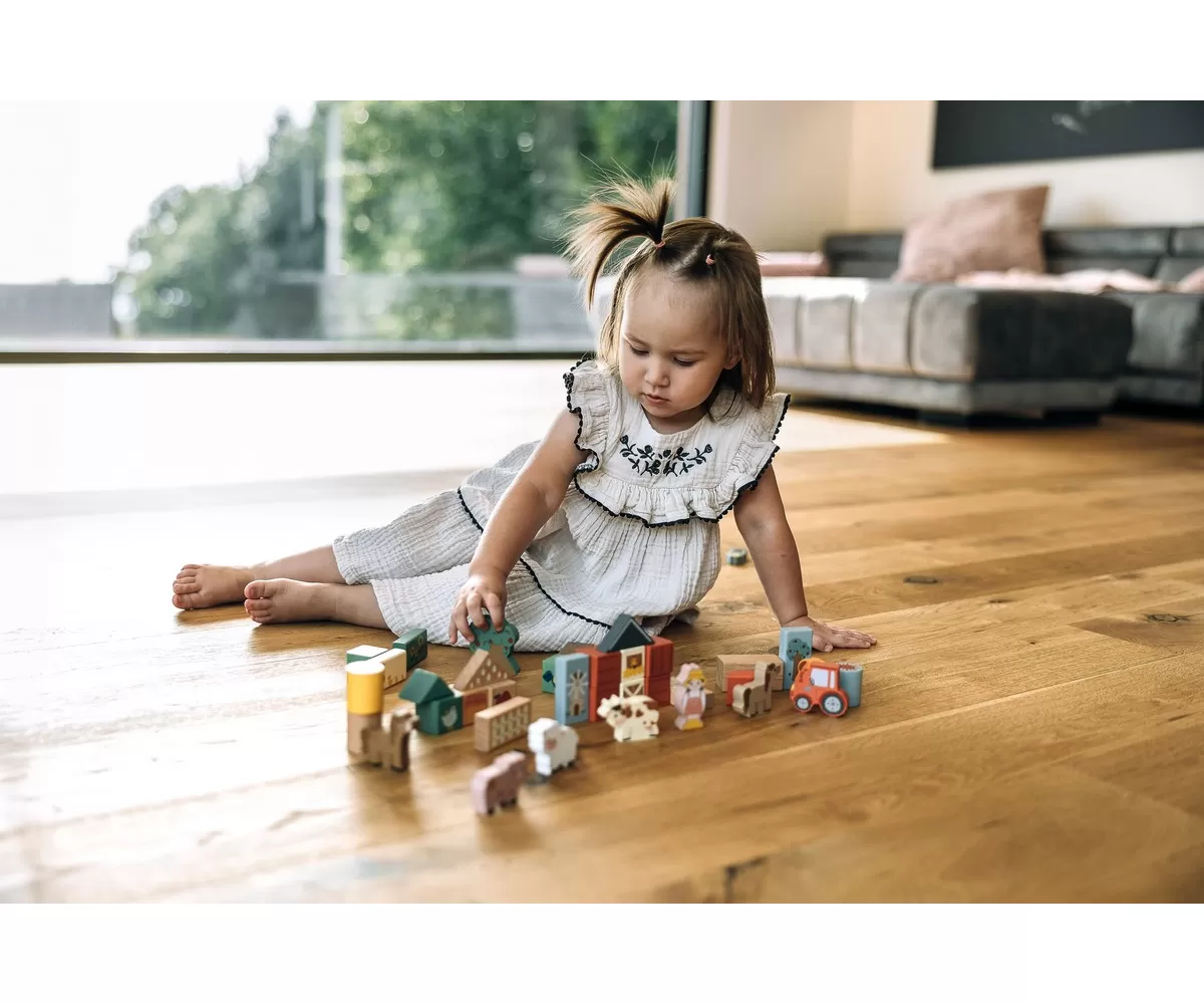 • dřevěná stavebnice s farmářským motivem pro kreativní hru