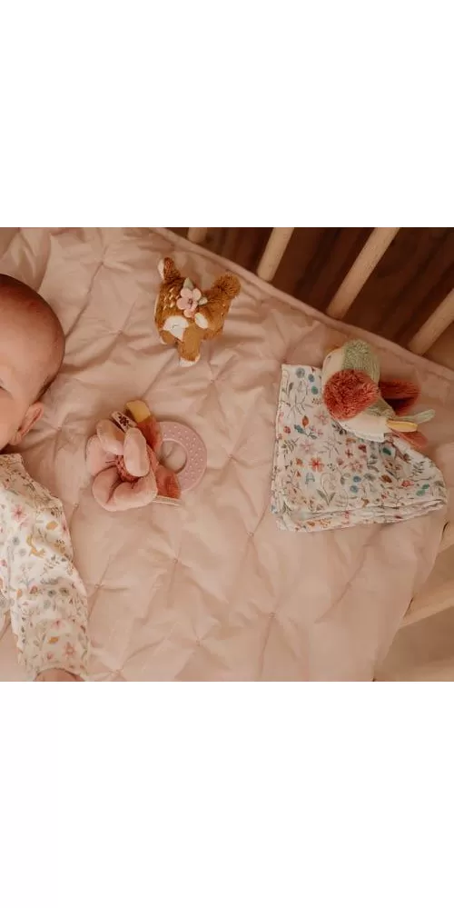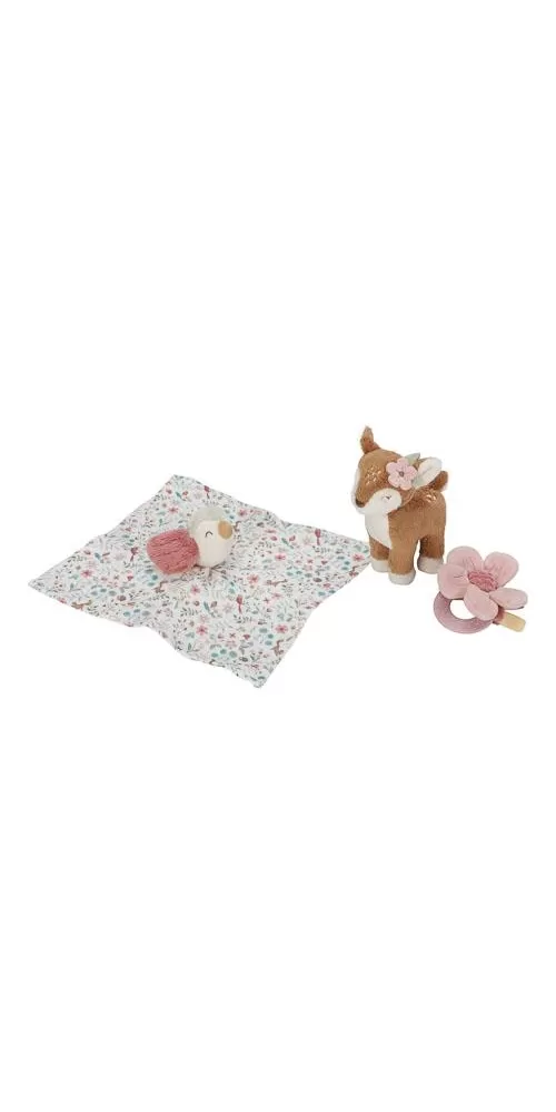Krásná dárková sada plyšových hraček je ideální jako dárek pro novorozené miminko. Sada obsahuje kousátko s kytičkou, muchláčka s ptáčkem a plyšovou srnku.