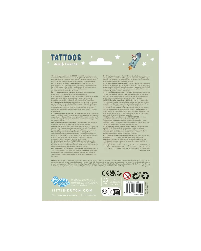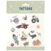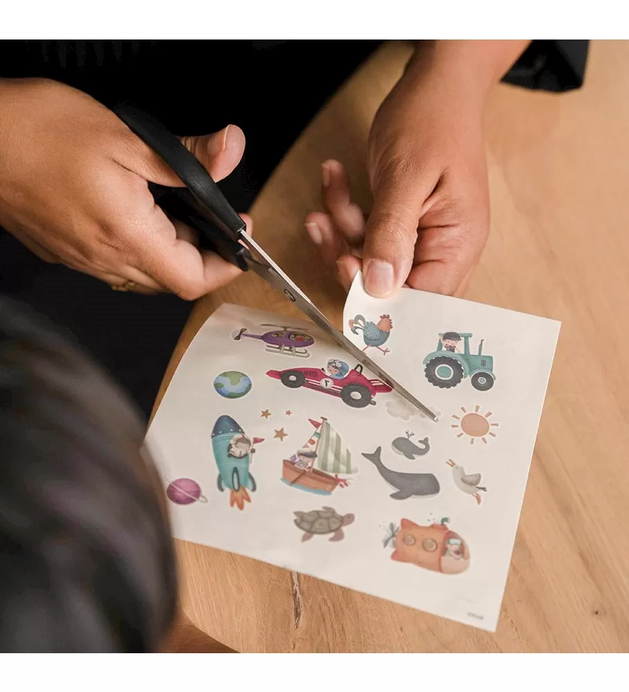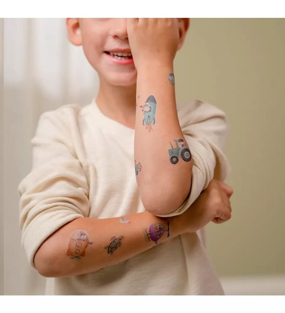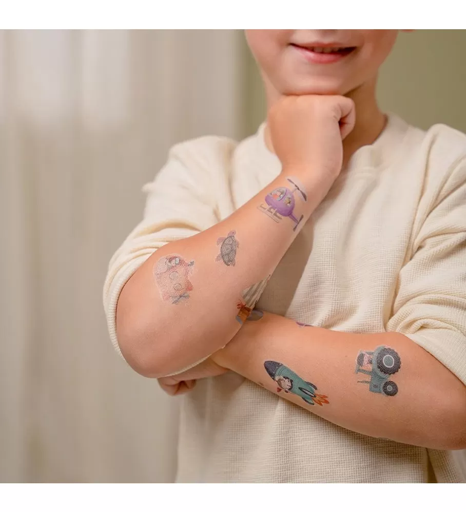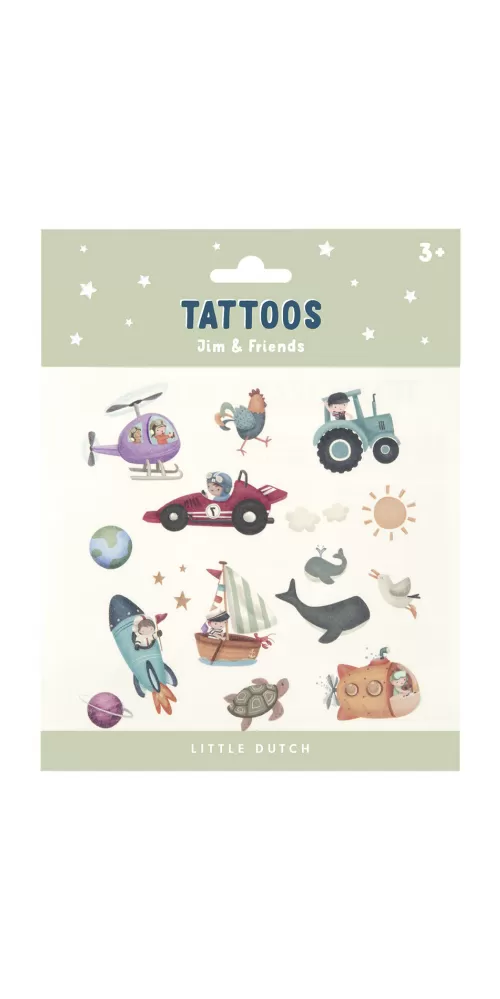 Dočasné dětské tetování s krásnými motivy Jima a různých dopravních prostředků a zvířat. Samolepicí tetování se snadno aplikuje s pomocí vlhké houbičky.