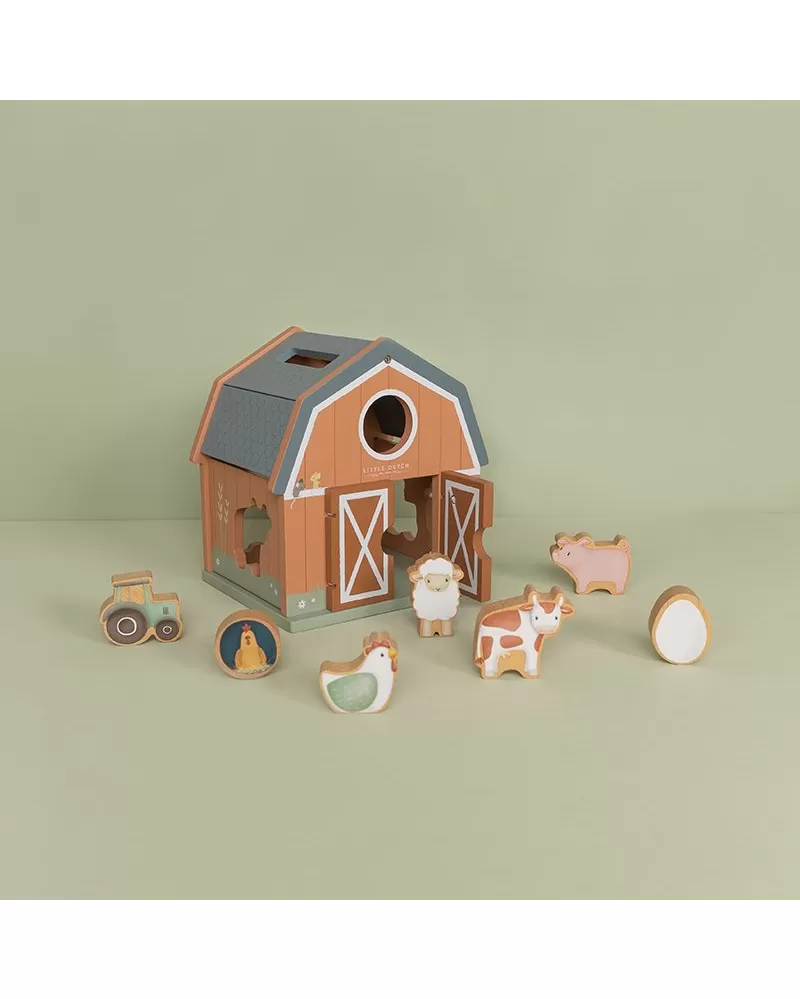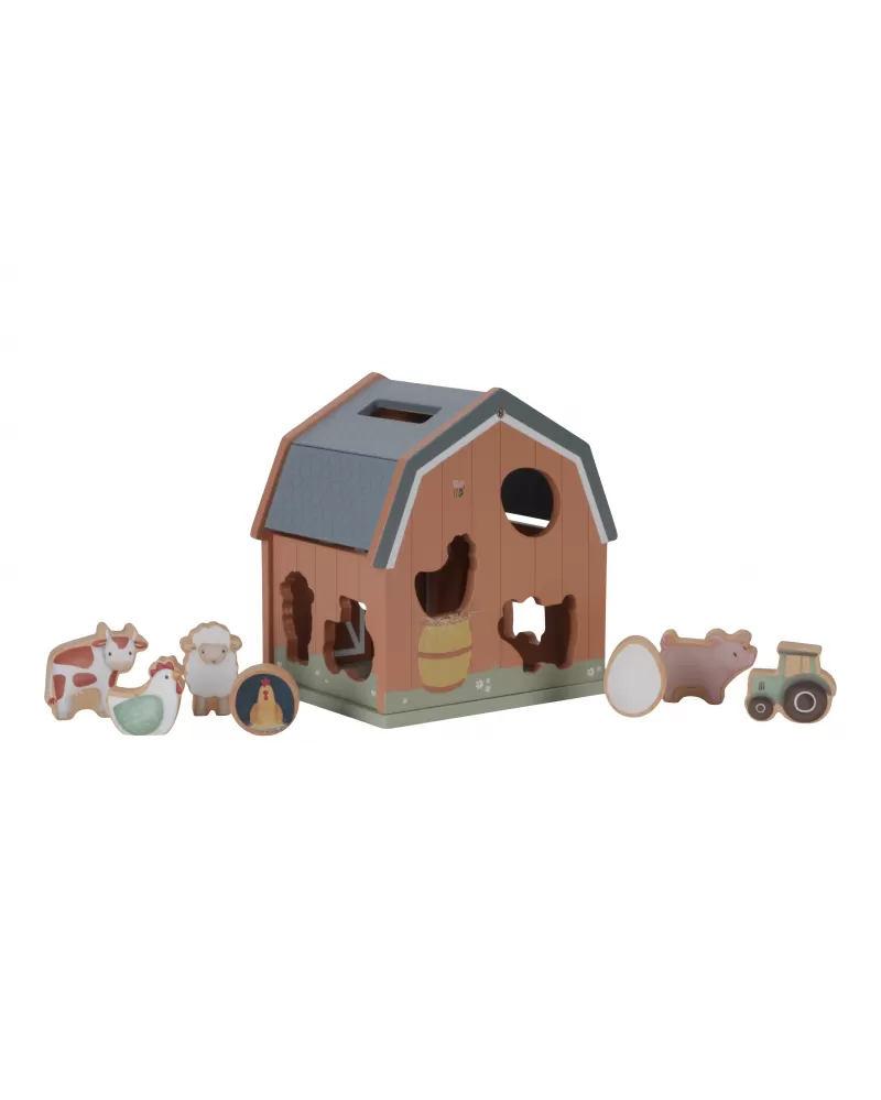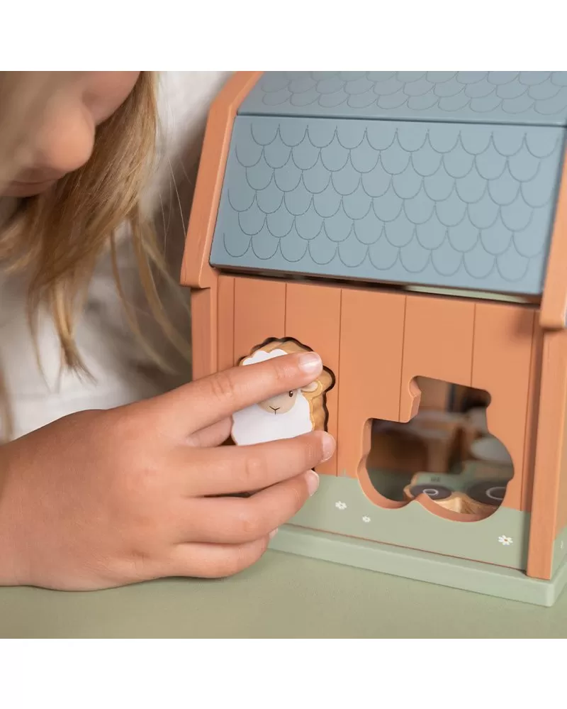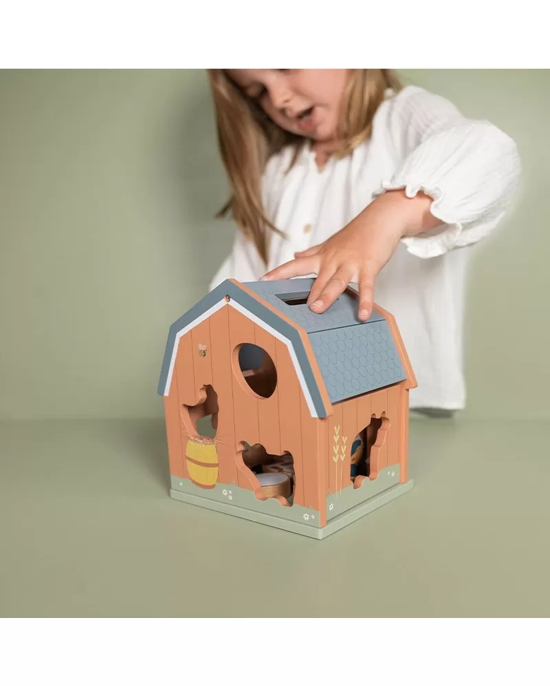 Dřevěný domek v podobě stodoly pro zvířátka učí děti kreativním zpsůobem rozpoznávat tvary a zdokonalit svou koordinaci rukou a očí. Malé ručičky snadno uchopí figurky různých tvarů a pak je zatlačí do správného otvoru.