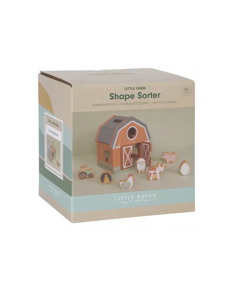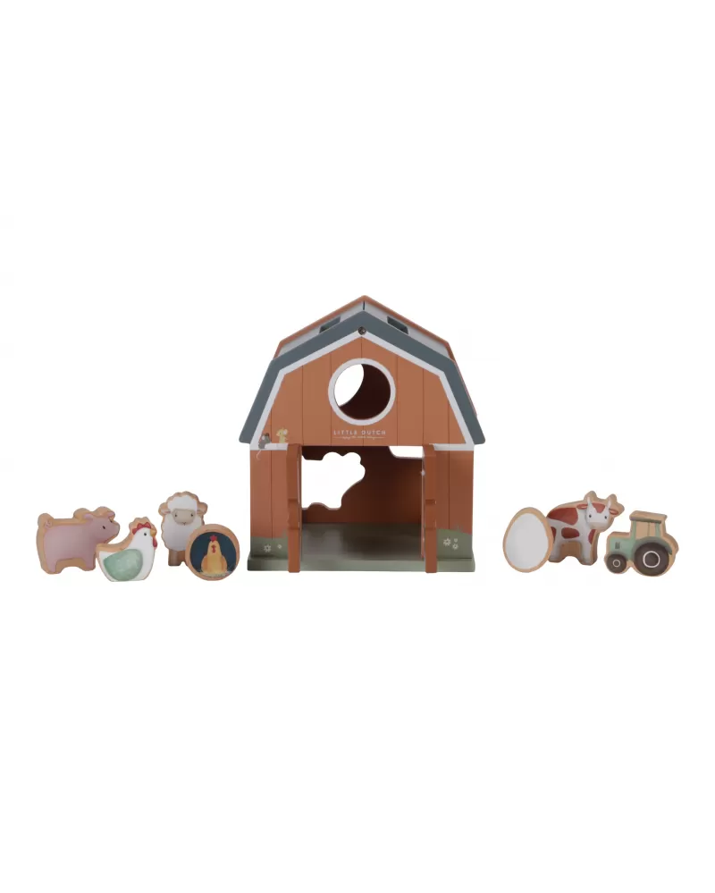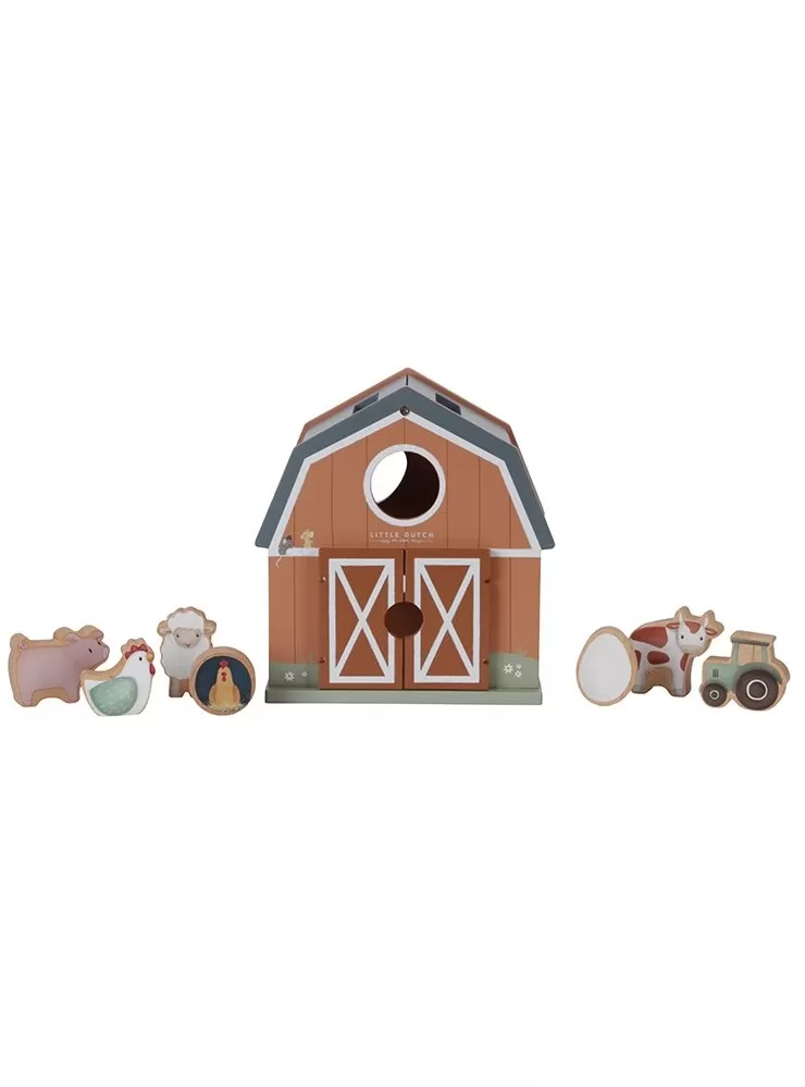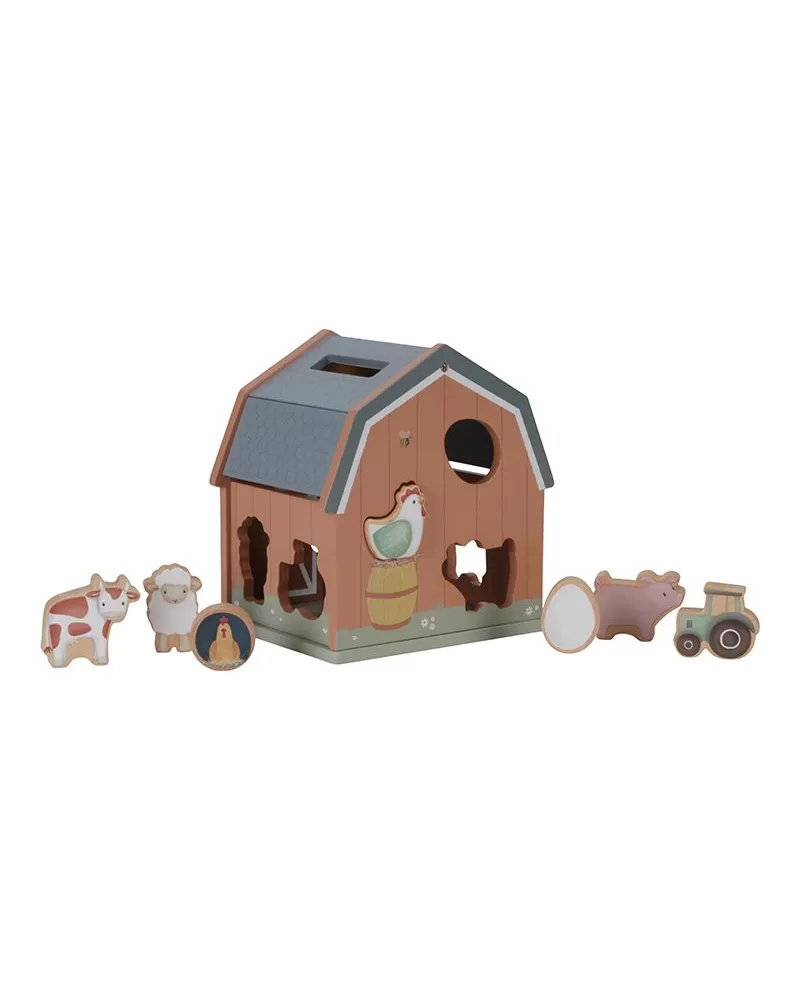 Dřevěný domek v podobě stodoly pro zvířátka učí děti kreativním zpsůobem rozpoznávat tvary a zdokonalit svou koordinaci rukou a očí. Malé ručičky snadno uchopí figurky různých tvarů a pak je zatlačí do správného otvoru.