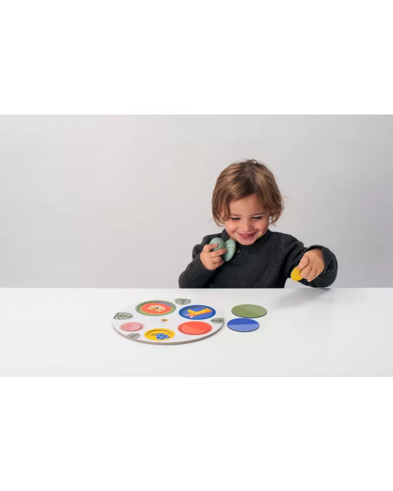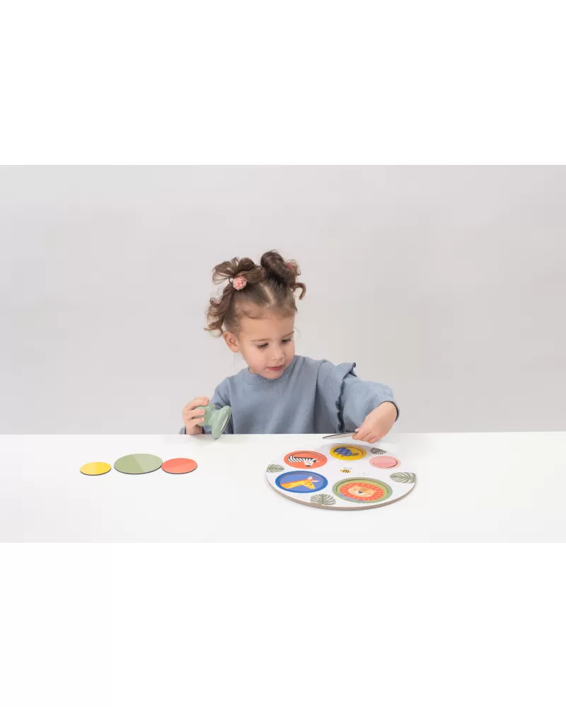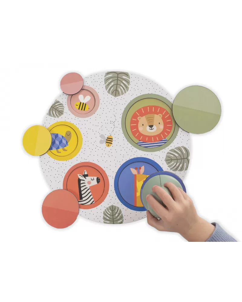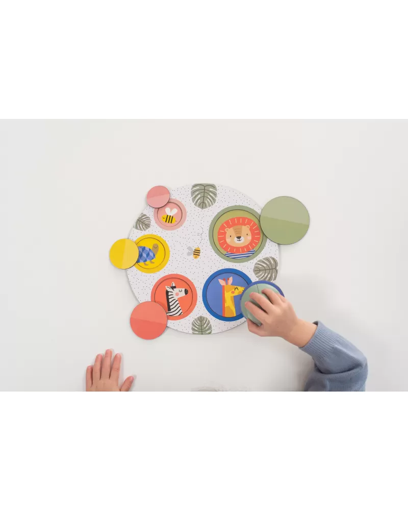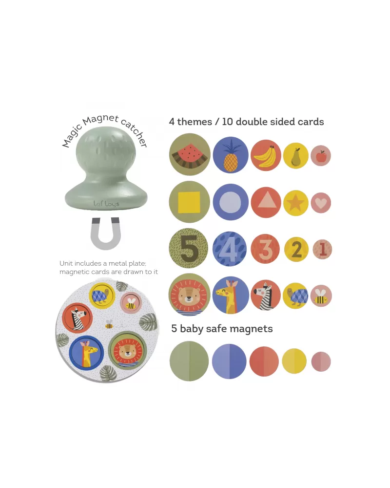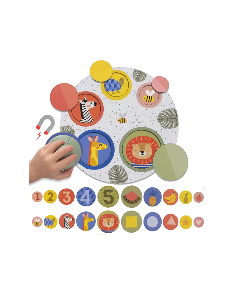 Originální magnetickou hru tvoří hrací podložka, ilustrované kulaté kartičky, magnetické kulaté kartičky a magnetický chytač. Hra je ideální pro společné hraní dítěte s rodiči, přinese vám spoustu společné zábavy a zároveň vám umožní učit dítě zábavnou formou rozpoznávat zvířátka, barvy, tvary i čísla.